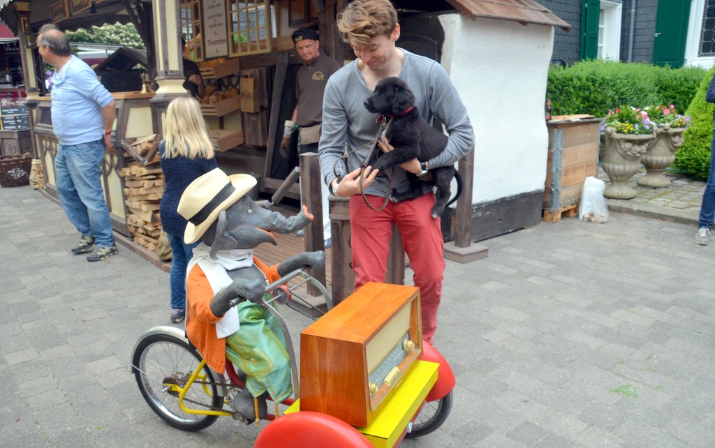 Überall, wo er auftaucht, zaubert er den Menschen ein Lächeln ins Gesicht. Jochen, der Elefant, dreht auf dem kleinen Fahrrad seine Runden, vor sich ein altes Röhrenradio. Für jeden hat er einen flotten Spruch auf Lager und stiehlt allen die Show. Vor einer Frauengruppe lässt er singend seinen Charme spielen: „Ich brech‘ die Herzen der stolzesten Frauen.“ Ein paar Meter hinter ihm geht Matthias Trautmann. Der studierte Puppenspieler hat die Figur selbst entworfen. „Der Elefant an sich ist ja immer ein Sympathieträger.“ Hier lenkt er Jochen unbemerkt über eine Fernsteuerung. Das Mikro ist so klein, dass es nicht auffällt.