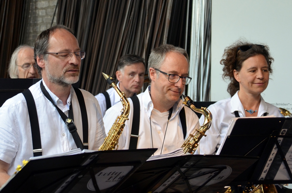 Für das diesjährige Musikfest hat Voigt die Sängerin Sanna Städtler aus Haan eingeladen. „Wir kennen uns seit über 20 Jahren“, verrät die Sängerin, die mit kraftvoller Alt-Stimme die Besucher ganz schnell in ihren Bann zieht. „Ich fühle mich wohl auf der Bühne.“ Das spürt man deutlich, als sie Songs wie „Georgia on My Mind“ von Hoagy Carmichael und Cole Porters Song „Night and Day“ zum Besten gibt. „Somewhere Over the Rainbow“ darf natürlich nicht fehlen. Die Zuhörer sind begeistert und verlangen nach einer Zugabe. Band und Sängerin bekommen den wohl verdienten Applaus.