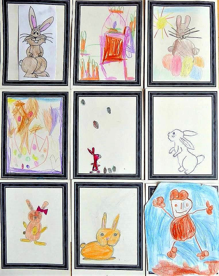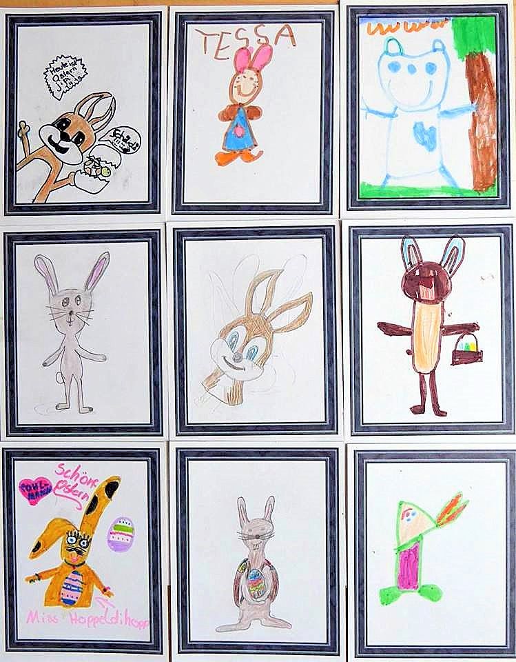 „Jedes Bild hat seinen ganz eigenen Charme“, so Pohlmann. Da gibt es Hasen mit Schleifen in den Ohren, mit Armbanduhr und natürlich mit Möhren und Osterei. Gewonnen haben letztendlich Valeries (5) Picasso-Osterhase, der Hase mit Schlappohr von Michal (9), Isas (8) Hase mit Schleife am Ohr und der gefleckte Hase von Carolina (6), der laut Frauke Pohlmann möglicherweise auch ein Kaninchen sein könnte.