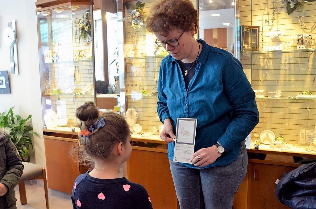 Valerie ist schon ganz ungeduldig. Sie möchte gerne ihren Hasen haben. Aufgeregt nimmt sie ihn in Empfang und vergleicht den Anhänger mit dem Bild. „Habe ich das richtig gemacht?“, vergewissert sich die Goldschmiedin lächelnd. Valerie bekräftigt das mit einem klaren „Ja“. Auch Isa und Carolina strahlen über ihren Silberhasen. Der vierte Gewinner, Michal, kann heute nicht dabei sein.