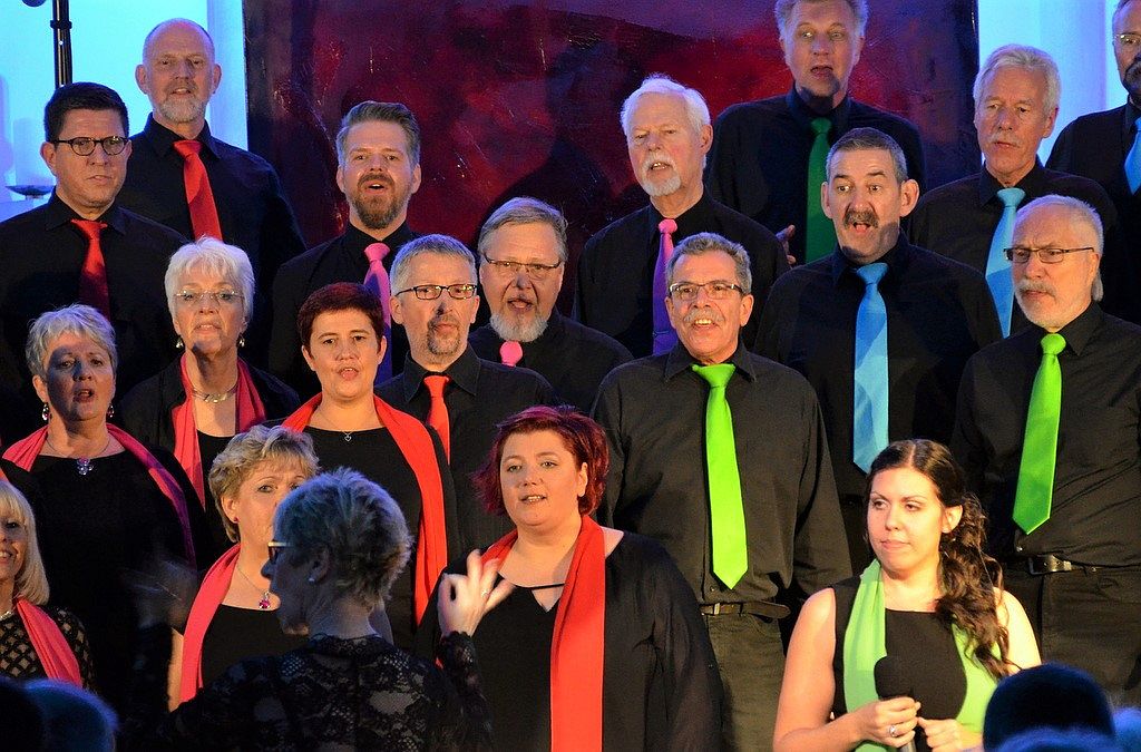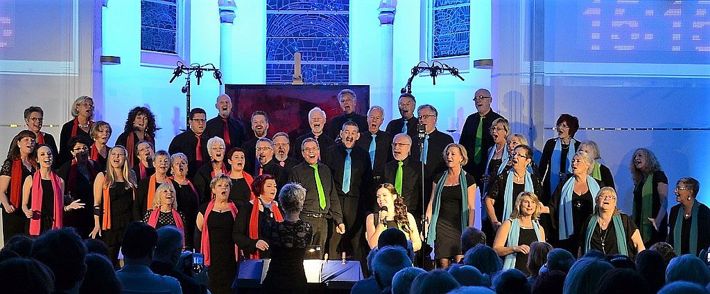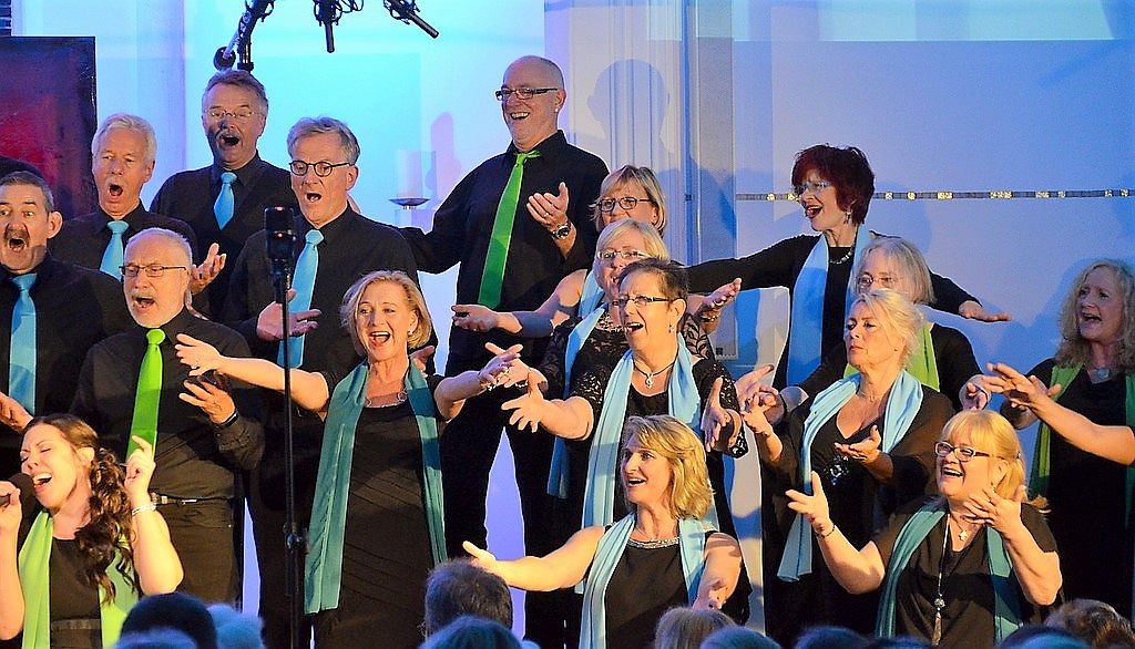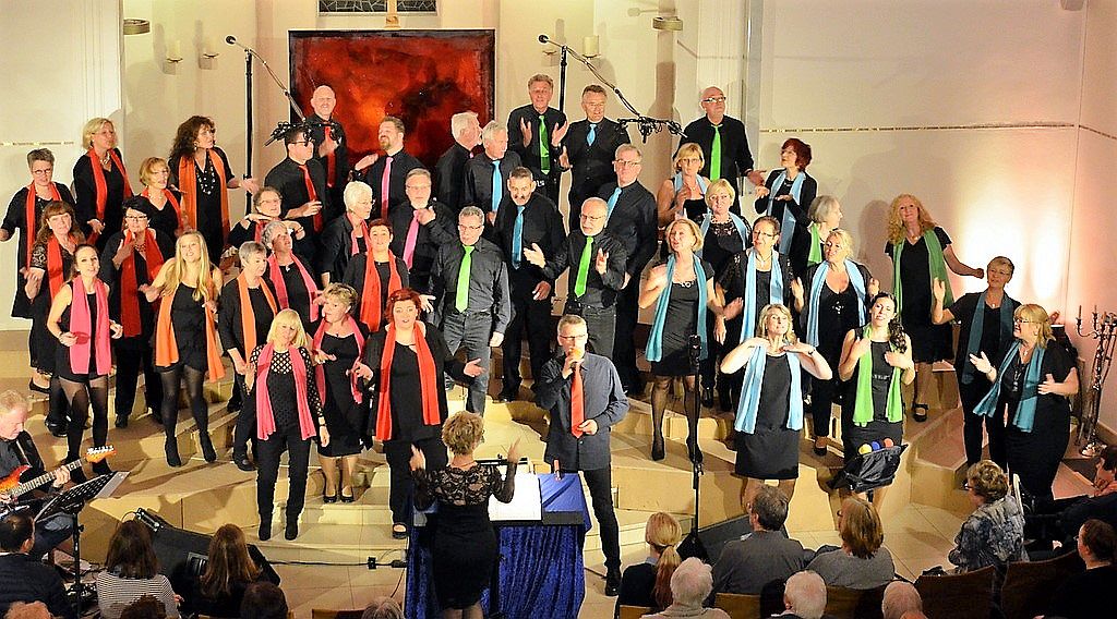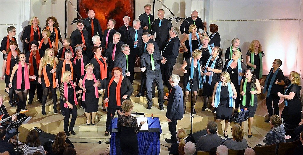 Großen Anklang fand die humorvolle Einlage zu Mozarts kleiner Nachtmusik. Die Herren mit ihren weißen Zopfperücken, die Damen mit Fächer sorgten für amüsiertes Schmunzeln. Ein steter Wechsel von heiter bis besinnlich, von kraftvoller Powermusik zu berührenden leisen Tönen. Jede Sängerin und jeder Sänger ließ die Zuhörer spüren, mit wie viel Begeisterung alle dabei sind und wie groß die Freude ist, die sie beim Singen erfahren. Für farbige Akzente sorgte der immer schwarz gekleidete Chor mit bunten Schals bzw. Krawatten.