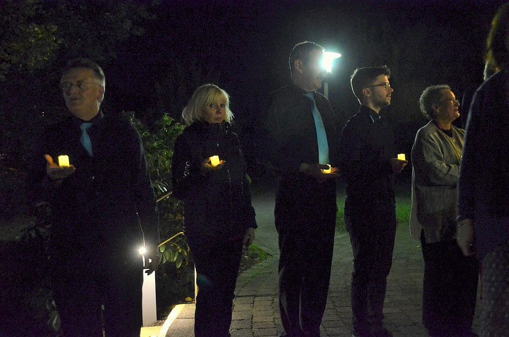Am Ende des Abends bedankte sich das Publikum mit frenetischem Beifall und Standing Ovations. Dafür gab es natürlich eine Zugabe. Und da hatte sich tatsächlich ein Schmetterling in die Kirche verirrt und nahm auf den Haaren einer Sängerin Platz. Zu den Klängen von „Peace be unto you“ begleitete der Chor seine Gäste mit Lichtern aus der Kirche.