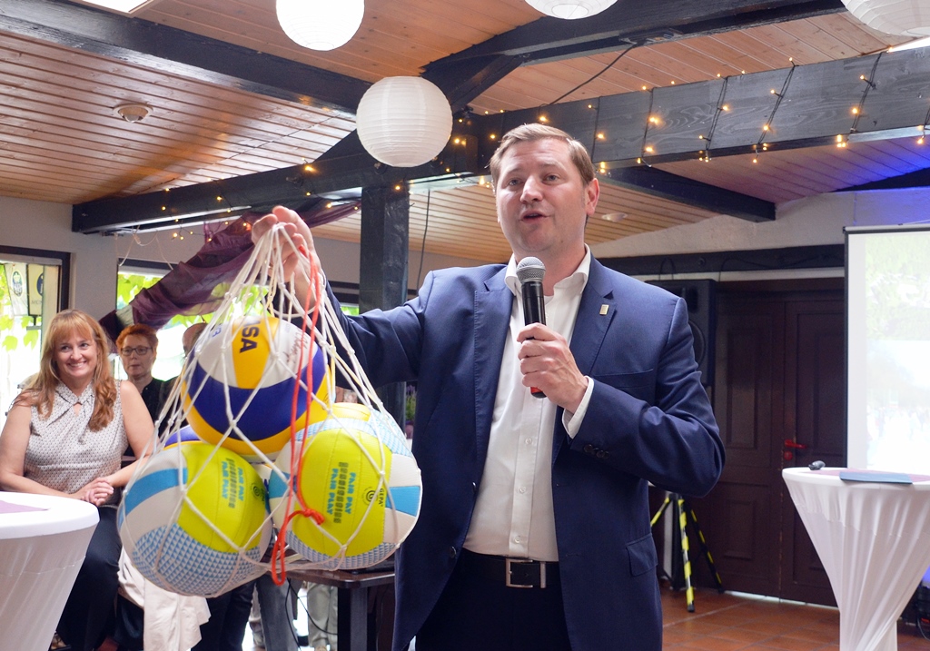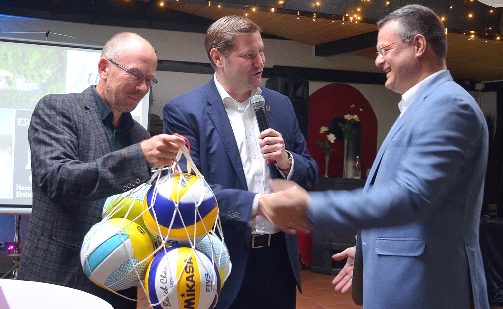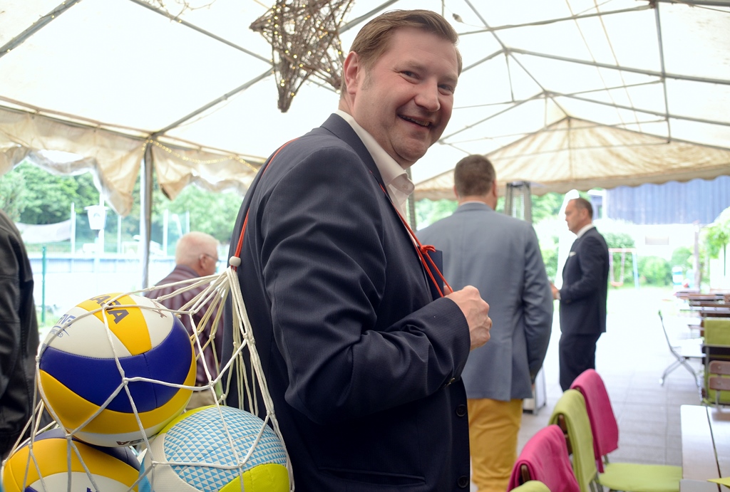 Mittlerweile finden auch andere sportliche Aktivitäten im Ittertal statt. Für künftige Beachvolleyball-Turniere übergab der OB an Thomas Czeckay, den Betriebsleiter der Freizeitanlage Ittertal, ein großes Netz mit neuen Bällen.