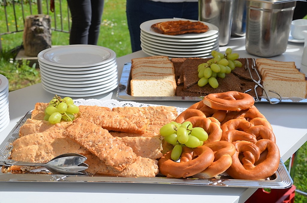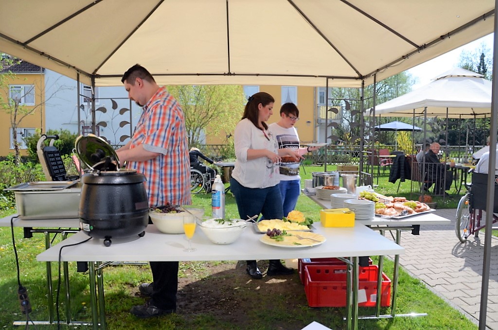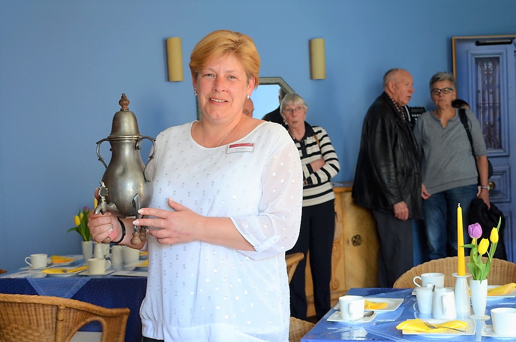 SOLINGEN (mh) – Bei strahlendem Sonnenschein fand am Dienstag in der Seniorenresidenz SenVital die Eröffnung des Kommunikationstreffpunktes „Café Dröppelmina“ statt. Zum Auftakt gab es eine große Bergische Kaffeetafel mit allem, was dazugehört. Viele waren der Einladung gefolgt und saßen gemütlich bei Waffeln mit Milchreis und heißen Kirschen, Bergischem Zwieback und Quark mit Marmelade unter Sonnenschirmen im behüteten Garten. Die Freunde der eher herzhaften Genüsse stärkten sich mit Käse und Kottenwurst. Der aromatische Kaffee kam allerdings nicht aus der Dröppelmina. Die hatte frei und stand als Dekoration im Inneren des Hauses.