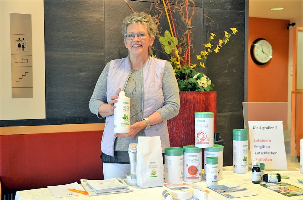 Gesund ging es auch am Stand von Ingrid Wenner zu. Sie informierte über spezielle Entgiftungskurse für den Körper. Entgiften, entschlacken, entsäuern heißt die Devise. Für eine Ernährungsumstellung bietet sie Kurse in Kleingruppen an. „Es ist ein Gesundheitskurs, kein Kurs zum Abnehmen“, erklärte die Ernährungstherapeutin und fügte hinzu: „Das Abnehmen ist ein Nebeneffekt. Der Körper soll wieder auf normalen Touren laufen. Dann gibt er ab, was er nicht braucht. Deshalb ist der Kurs auch für Konfektionsgröße 36 geeignet. Diese Teilnehmer nehmen nicht ab. Sie entgiften ihren Körper.“ Wenner ist als Gesundheitscoach schon lange in diesem Bereich tätig.