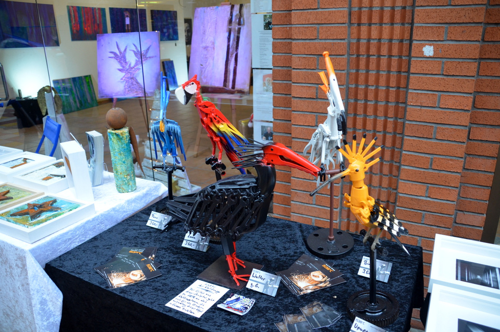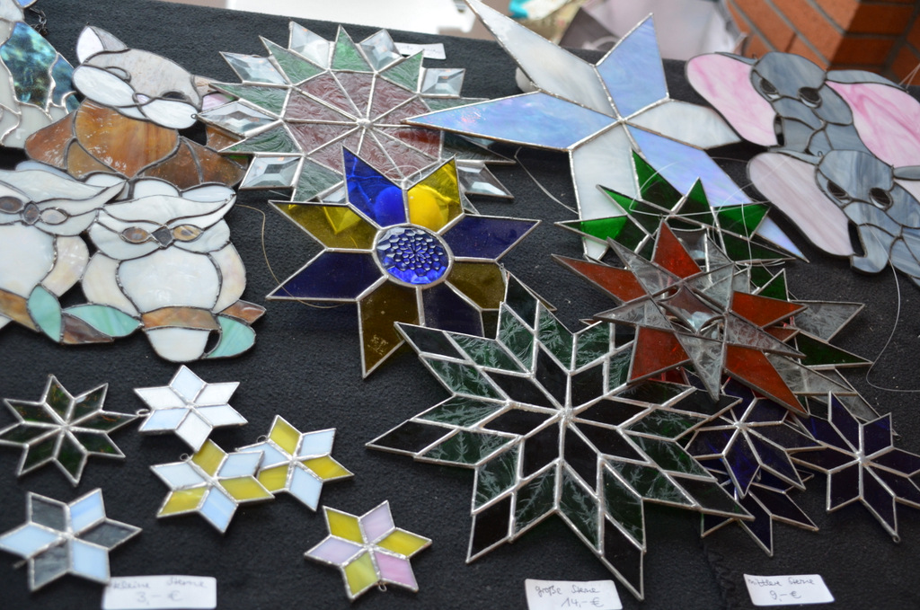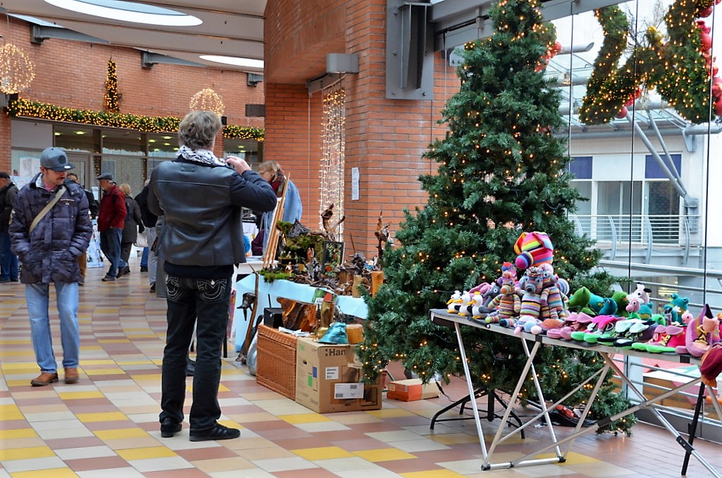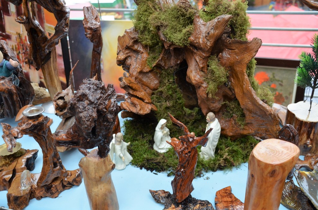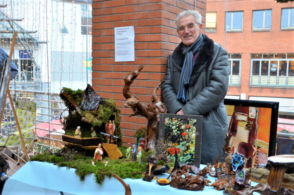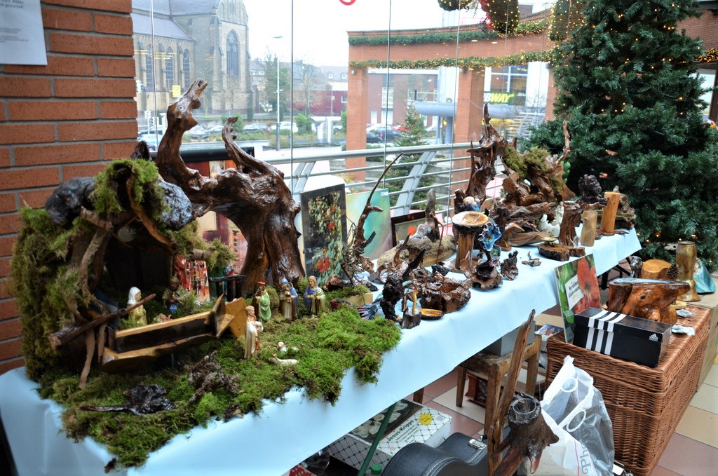 Obendrein hatten sich weitere 25 Künstler aus ganz NRW angemeldet und erfreuten die Besucher im Obergeschoss der Galerien mit ihren stimmungsvoll dekorierten Ständen. Bei der beeindruckenden Vielfalt der Angebote war für jeden Geschmack und Geldbeutel etwas dabei. Helmut Podubrin hatte aus teilweise 40 Jahre alten Wurzeln, die er selbst auf zahlreichen Spaziergängen gesammelt hatte, wundervolle Gebilde und aufwändige Krippen hergestellt. „Ich sehe in den Wurzeln auch immer etwas. Sie werden sorgfältig gesäubert, dann vorsichtig geschliffen und schließlich mit einem speziellen Klarlack überzogen“, beschrieb er seine Arbeitsweise. Manchmal bildet sich ein Elefantenkopf oder ein Fisch heraus. „Es ist alles von der Natur gemacht“, betonte Podubrin. Er selbst ändere nur Kleinigkeiten.