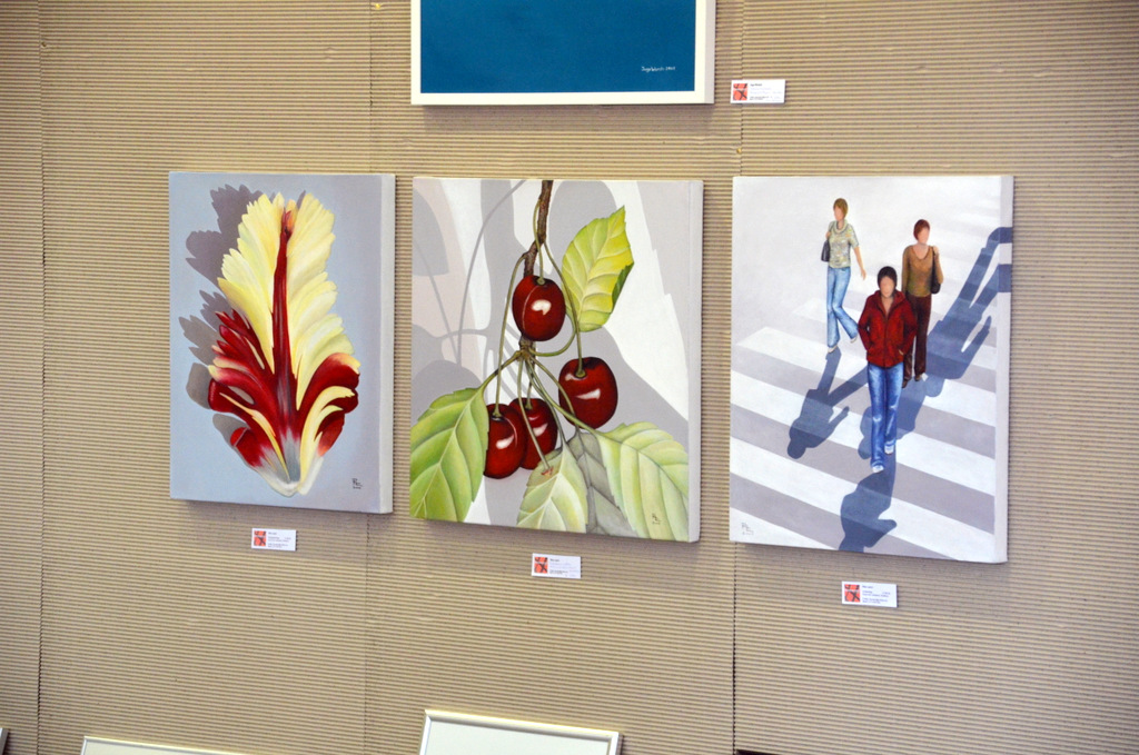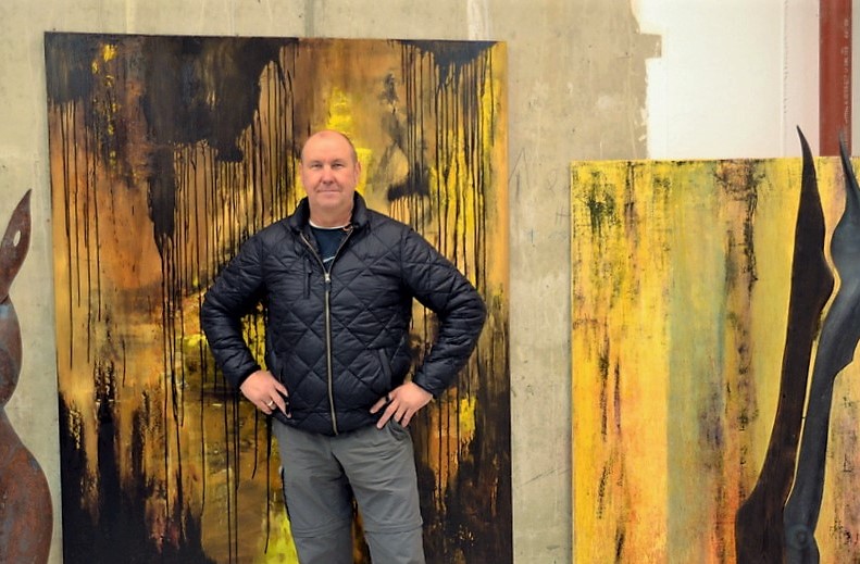Peter Wischnewski hatte neue großformatige Bilder von 120 x 140 cm bis hin zu 200 x 120 cm ausgestellt. „Ich arbeite gerne mit Marmormehl. Dadurch ergeben sich interessante Strukturen“, so der Künstler. Nach dem Trocknen werden die Bilder mit Tusche und Acryl oder Öl nachbearbeitet.