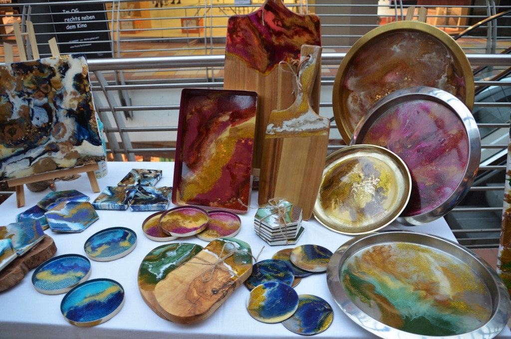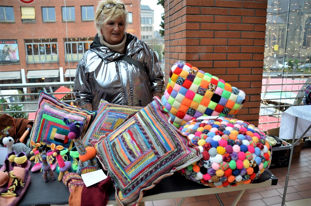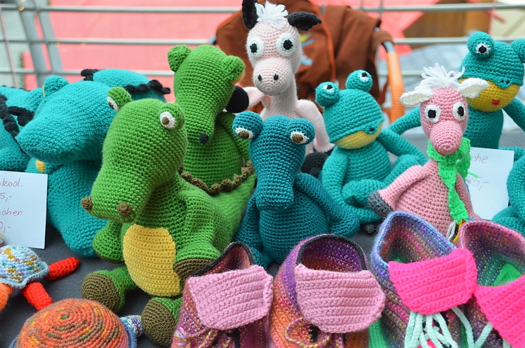 Bunt war es auch am Stand von Künstlerin Petra Wesemann. Ihre farbigen Kissen fielen schon von weitem ins Auge. Kleine Rosetten waren zu Objekten zusammengesetzt, farbige Wollreste verwandelten sich in Häkeldrachen. Jedes Teil ein Unikat. „Bei Kindern ist besonders der Schweinehund beliebt“, lachte sie. Das läge daran, dass er keinen Mund habe. „Man kann ihm alles anvertrauen. Er hört gut zu, aber erzählt nichts weiter.“ Ein perfekter Begleiter für jedes Kind.