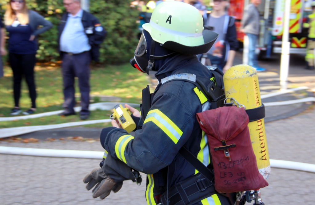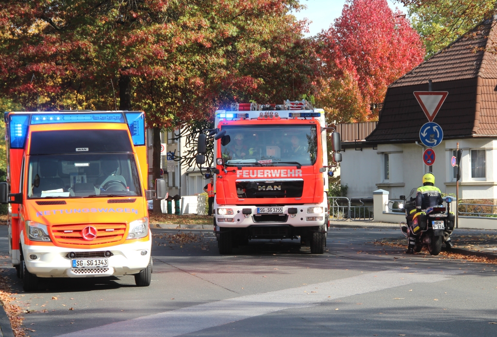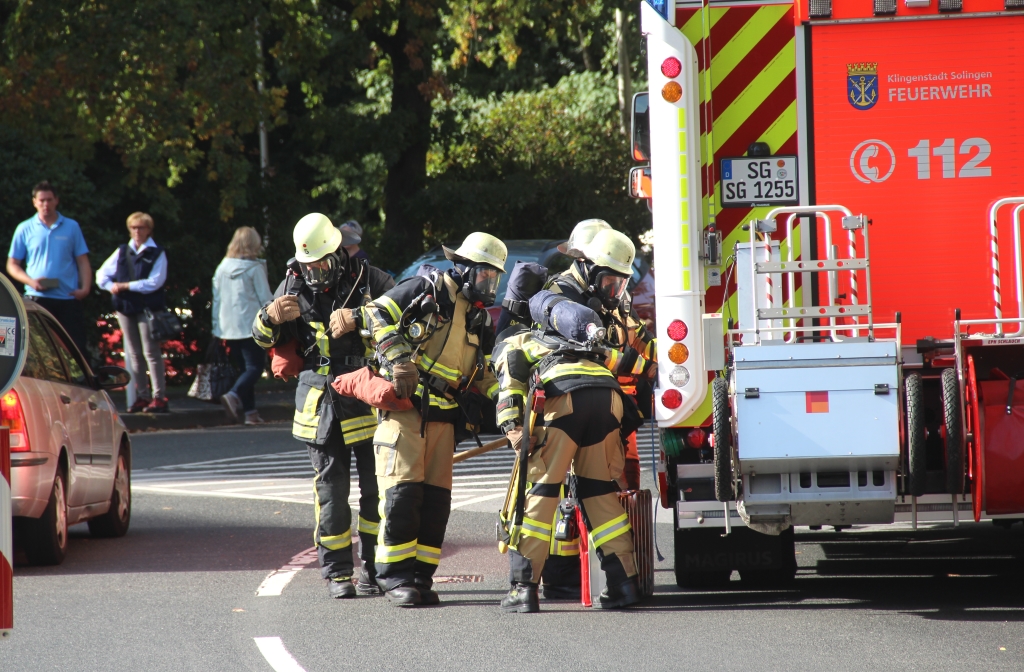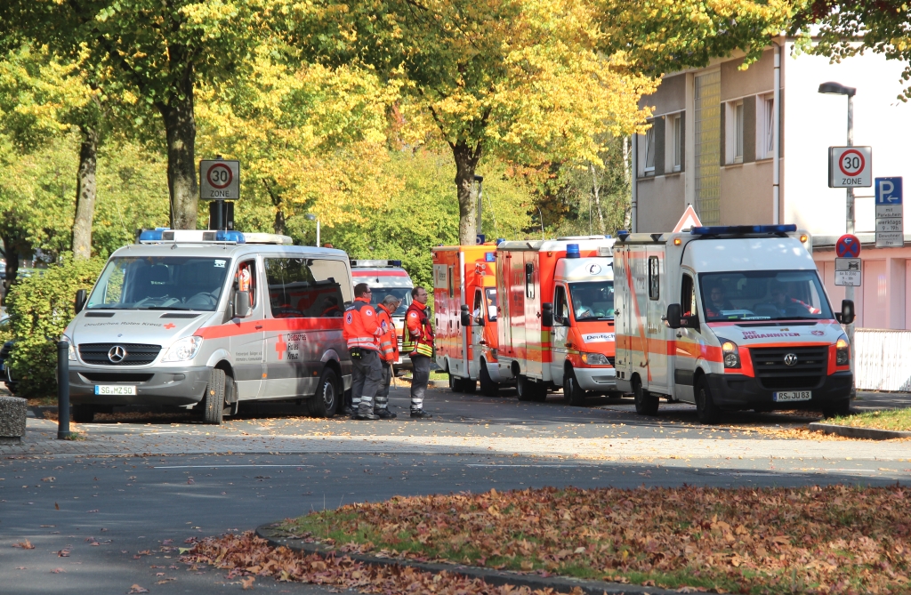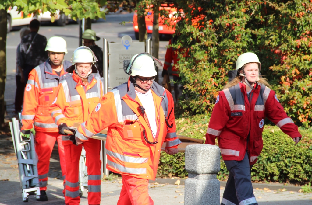 SOLINGEN (red/bgl) – Am Samstagnachmittag war rund um das Klinikum ab 14 Uhr so einiges los. Eine große Einsatzübung von Feuerwehr, Rettungsdienst und Katastropheschutz wurde abgehalten. Als Übungslage wurde ein Brand angenommen, der auf der Station G11 im 1. Obergeschoss des Hauses G des Klinikums ausgebrochen ist. Ausgehend von einem Patientenzimmer dehnte sich der Brand auf die angrenzenden Räume aus und führte dazu, dass die gesamte Station nach wenigen Minuten verraucht war. 23 Patienten der Station, gespielt von Übungsdarstellern des Deutschen Roten Kreuzes (DRK), wurden durch den Brand bedroht.