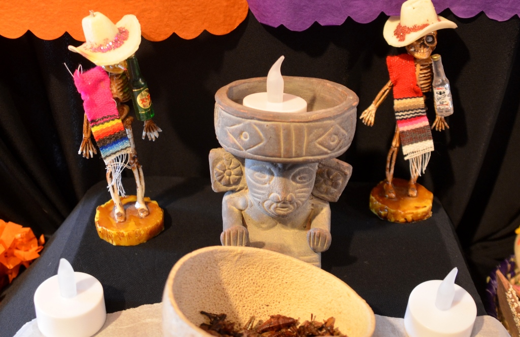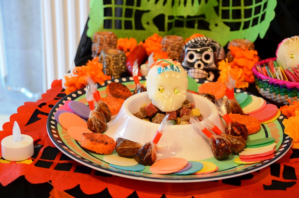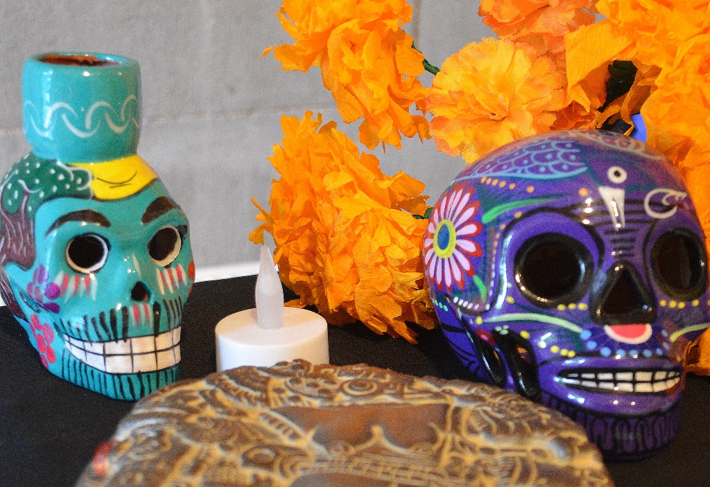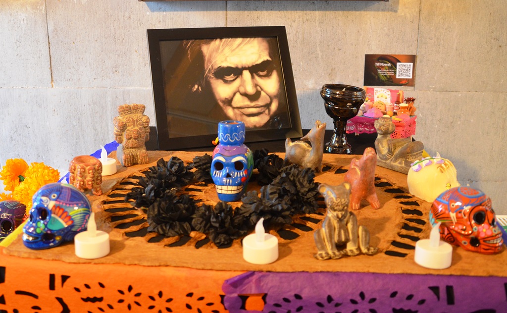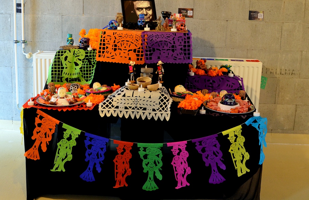 Bunt, verspielt, liebeswert und erschreckend wirkt der mexikanische Totenaltar. Die Süße des Zuckers in Form eines Totenkopfes, Xoloitzcuintle, der mexikanische Hund und Begleiter ins Totenreich. Der Altar ist übersäht mit leuchtend orangen Blüten. Wunderschön anzusehen, doch in Mexiko ist es die Farbe des Todes. Bunte Papiergirlanden zeigen Szenen mit Skeletten.