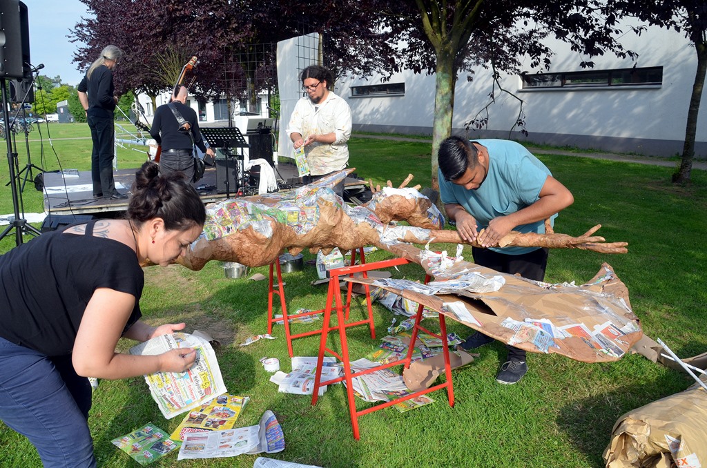 Während sich die drei Künstler des EyE:Projects auf eine weitere Performance vorbereiten, in der es um den „Anfang von Nichts“ geht, beginnen andere mit einem neuen Objekt. Im Laufe der Ausstellung werden die ansässigen und angereisten Künstler gemeinsam eine mexikanische Alebreji gestalten. Alebrejis sind Traumwesen aus Pappmaché. Als Kleber verwendet man traditionell eine Mischung aus Mehl, Wasser und Salz. Am Ende der Ausstellung soll die Skulptur fertig sein. Dann wird sie aufgestellt und dauerhaft im Südpark verbleiben.