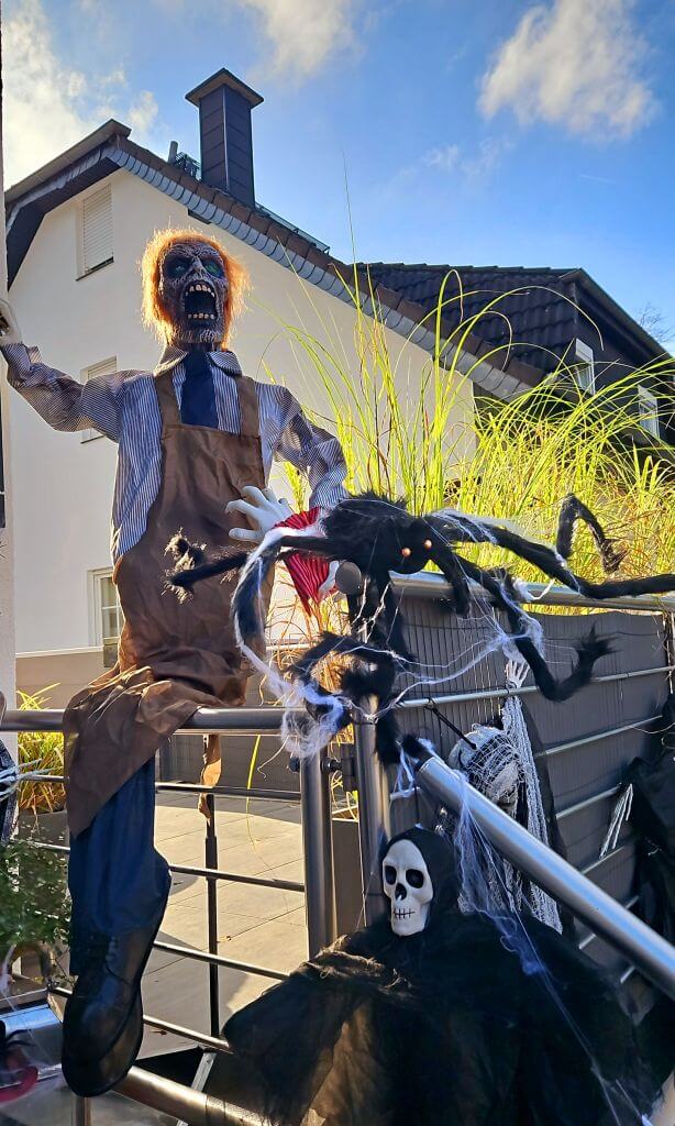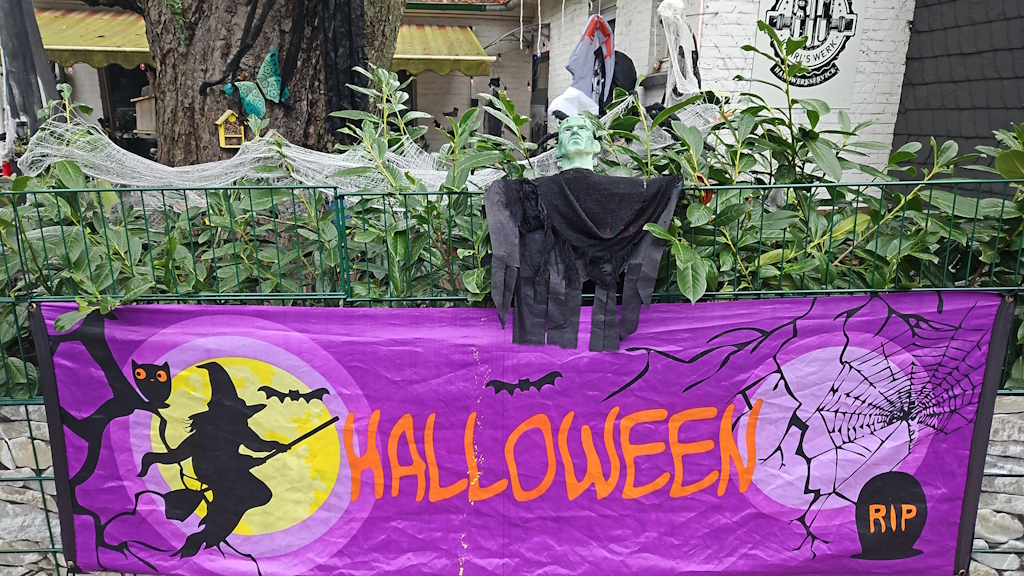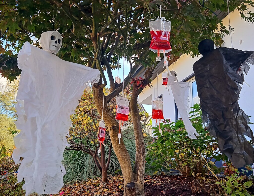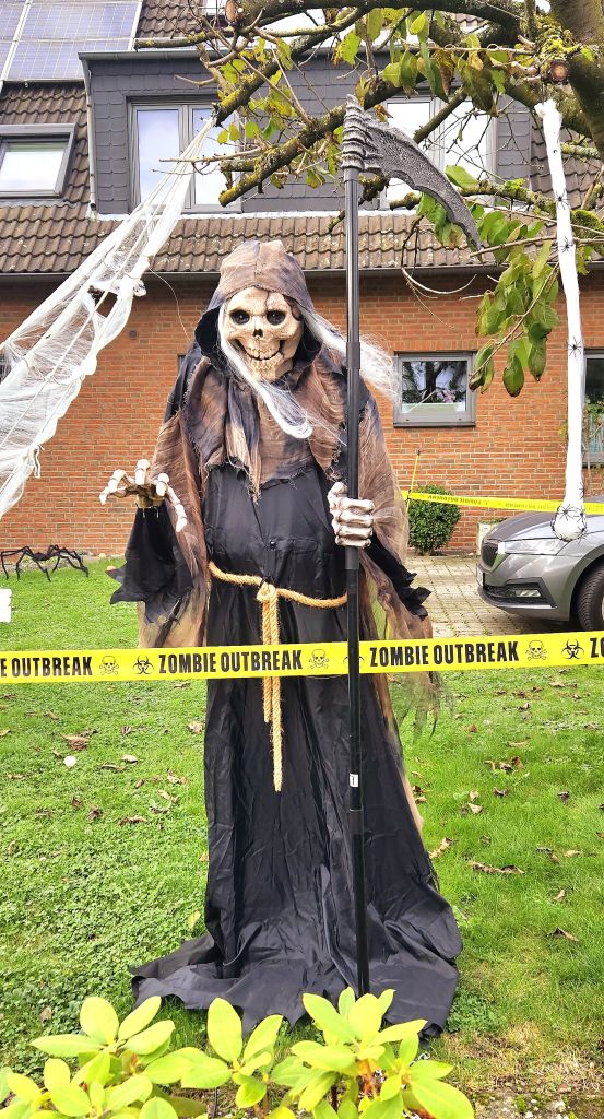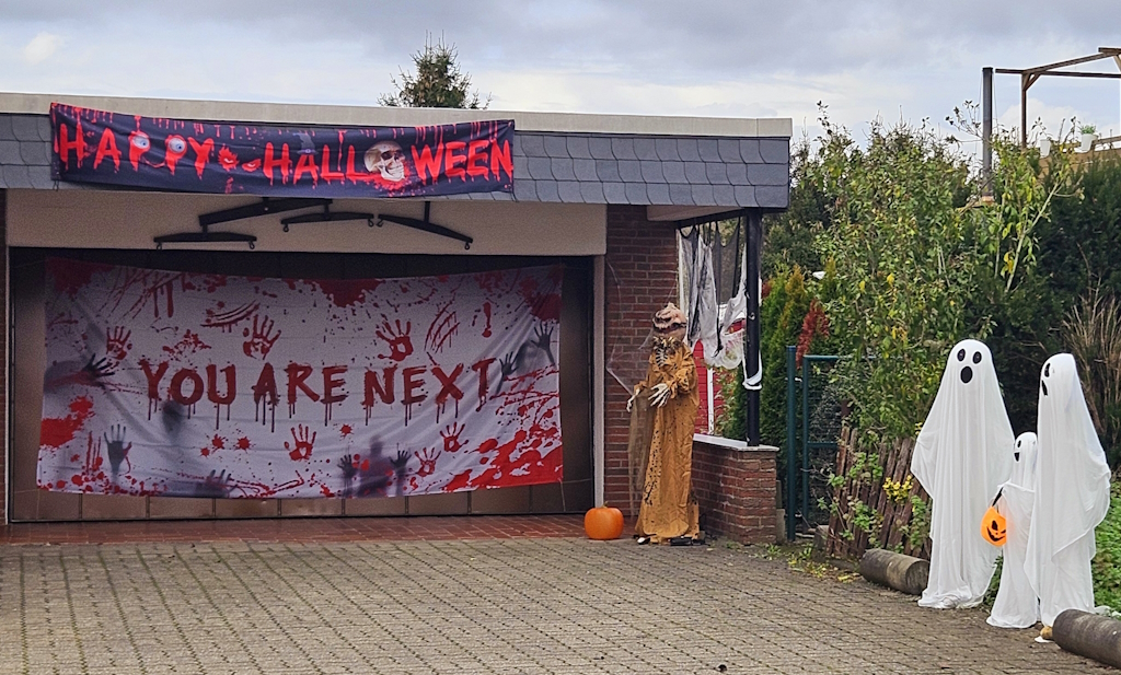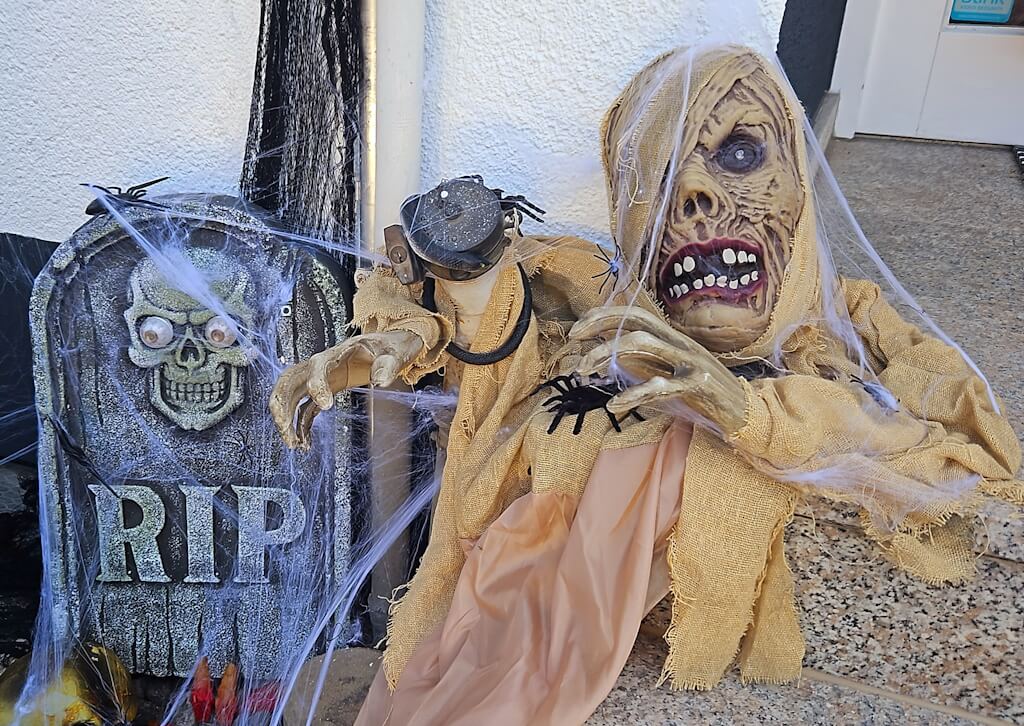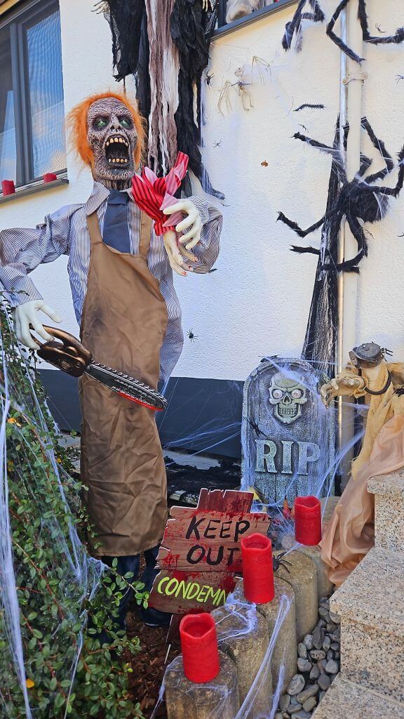 In der Fußgängerzone von Haan zieht eine „Halloween-Dangerzone“ die Aufmerksamkeit auf sich. Im Garten einer Familie verwandelt sich die Terrasse in eine „Walking Zombie Area“, die mit Warnschildern und schaurigen Figuren markiert ist. Ein Zombie und ein maskiertes Skelett „bewachen“ den Eingang, und eine Mumienfigur thront mit einem blutigen Kelch als Symbol für „Lebenselixier“ am Hintereingang. Diese kleine, aber feine Inszenierung schafft in Haan eine Attraktion, die den Besuchern Halloween in der City erlebbar macht.