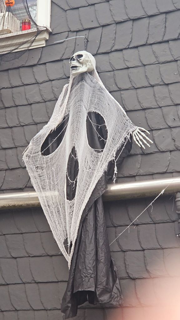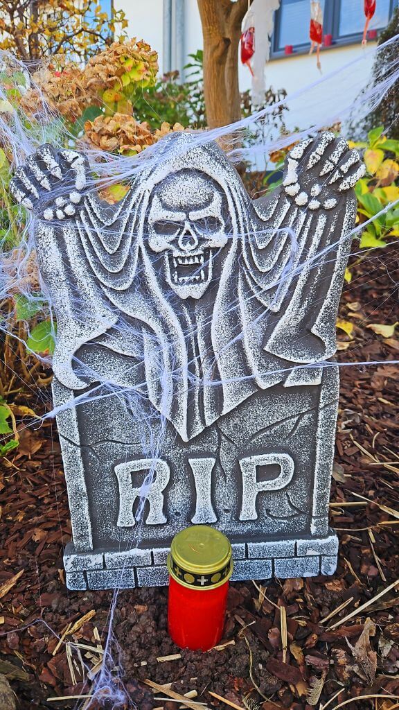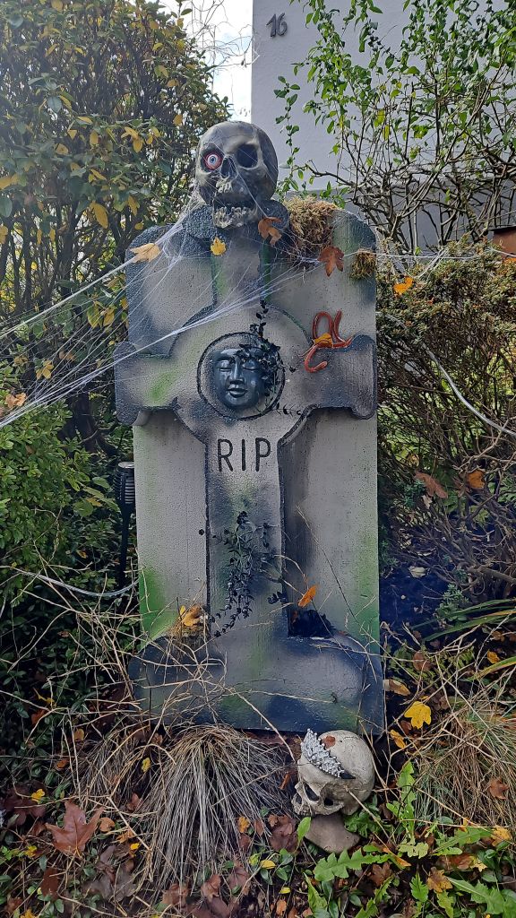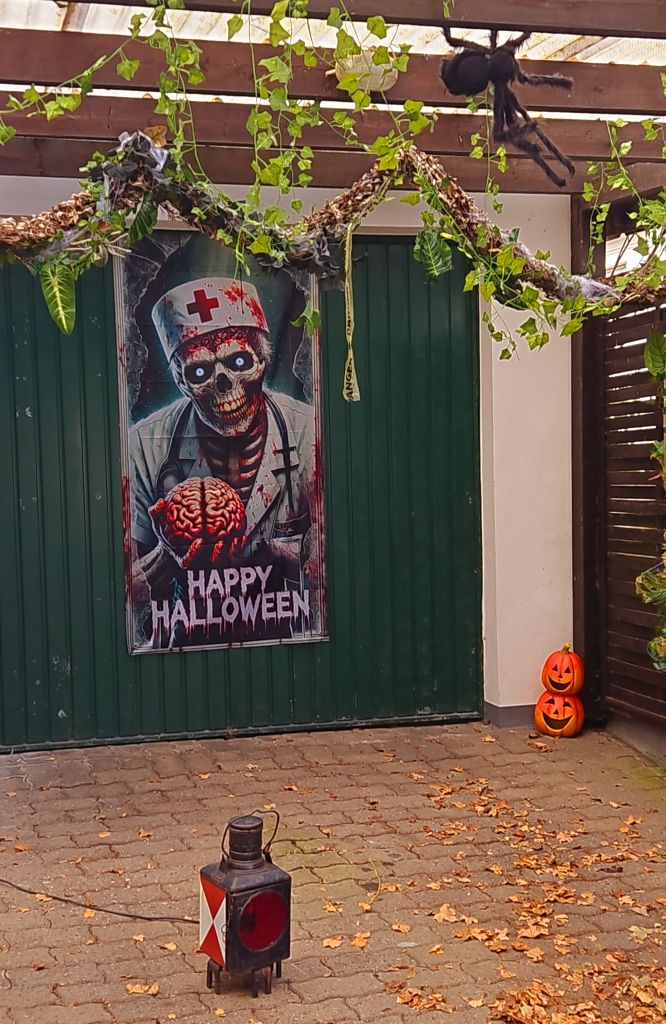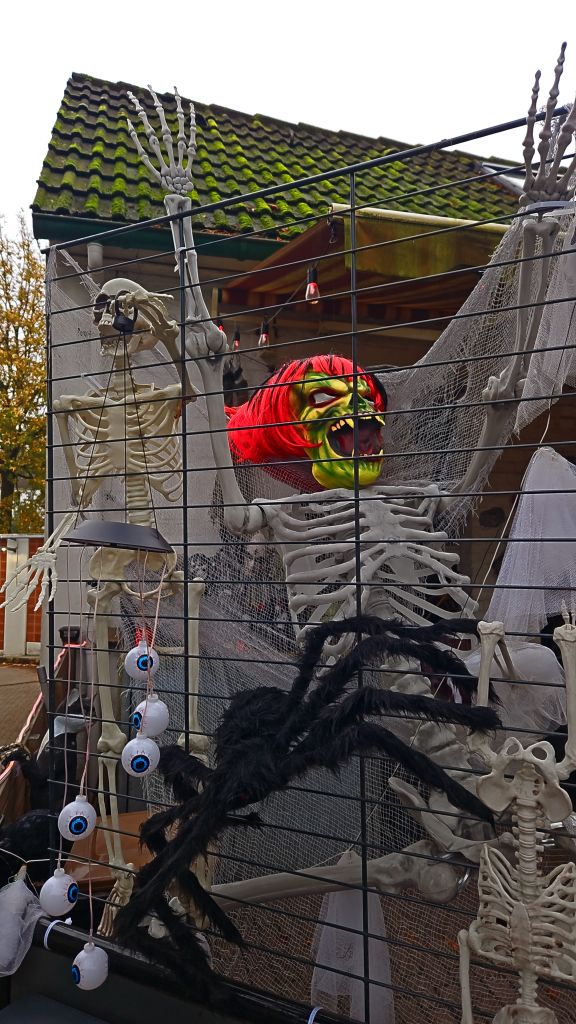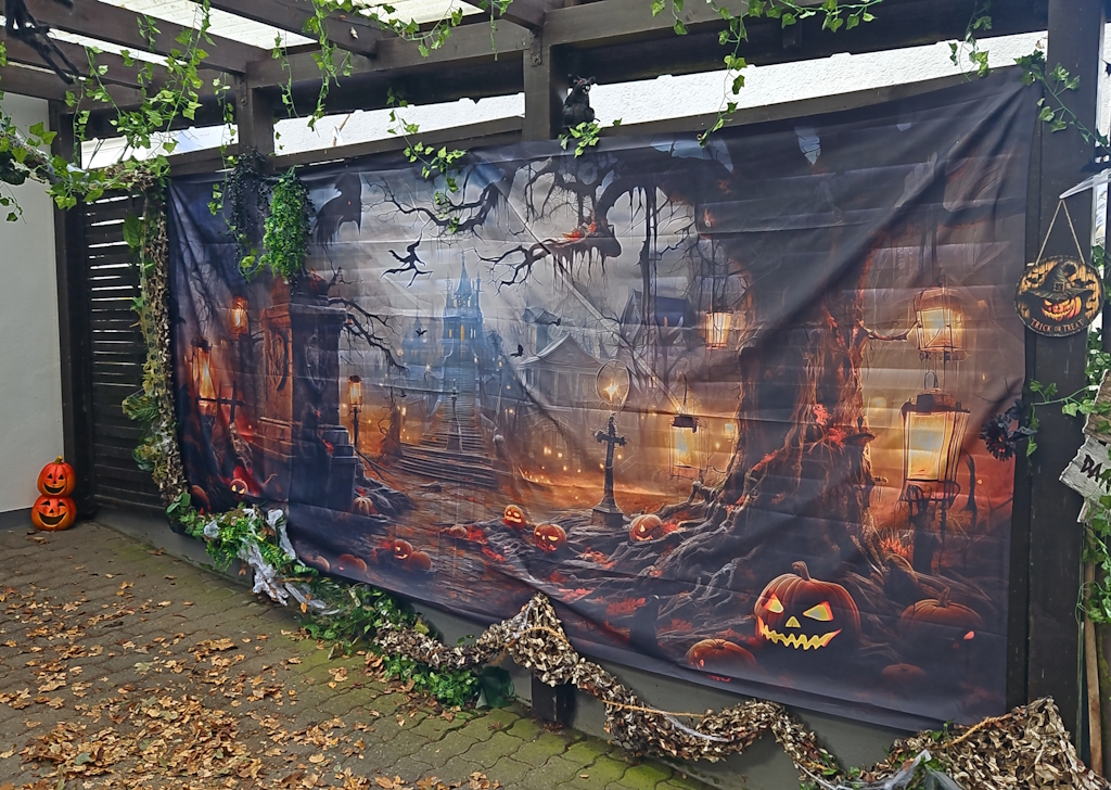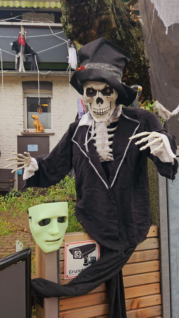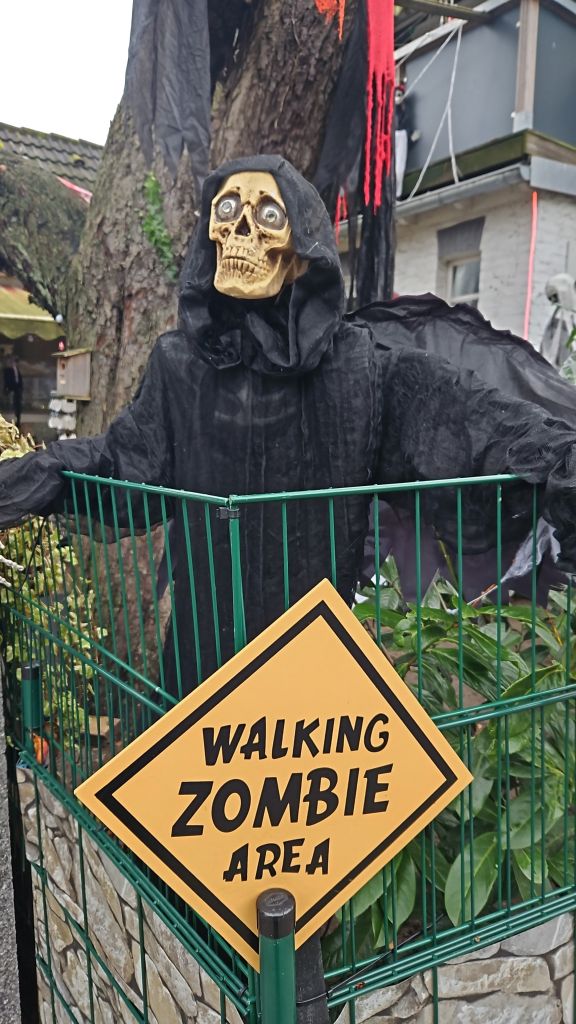 In der Fußgängerzone von Haan zieht eine „Halloween-Dangerzone“ die Aufmerksamkeit auf sich. Im Garten einer Familie verwandelt sich die Terrasse in eine „Walking Zombie Area“, die mit Warnschildern und schaurigen Figuren markiert ist. Ein Zombie und ein maskiertes Skelett „bewachen“ den Eingang, und eine Mumienfigur thront mit einem blutigen Kelch als Symbol für „Lebenselixier“ am Hintereingang. Diese kleine, aber feine Inszenierung schafft in Haan eine Attraktion, die den Besuchern Halloween in der City erlebbar macht.