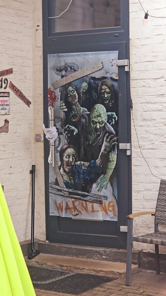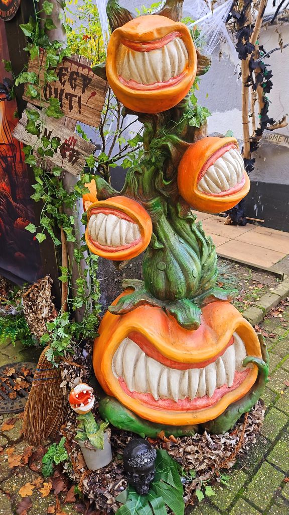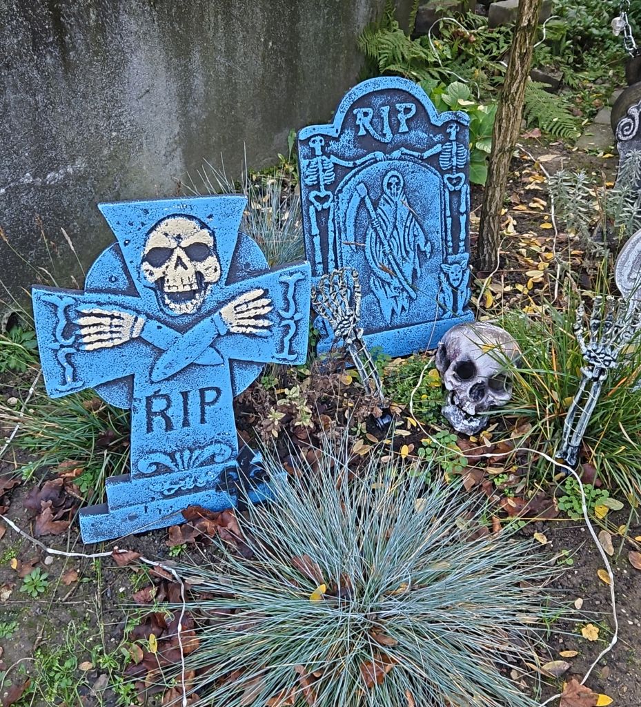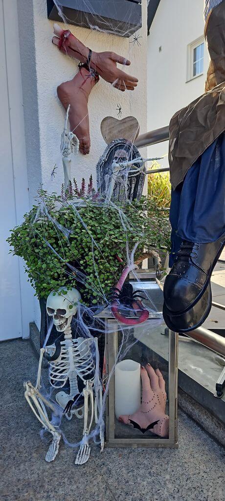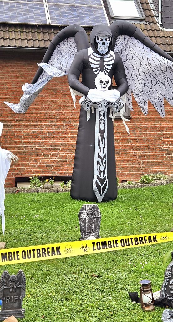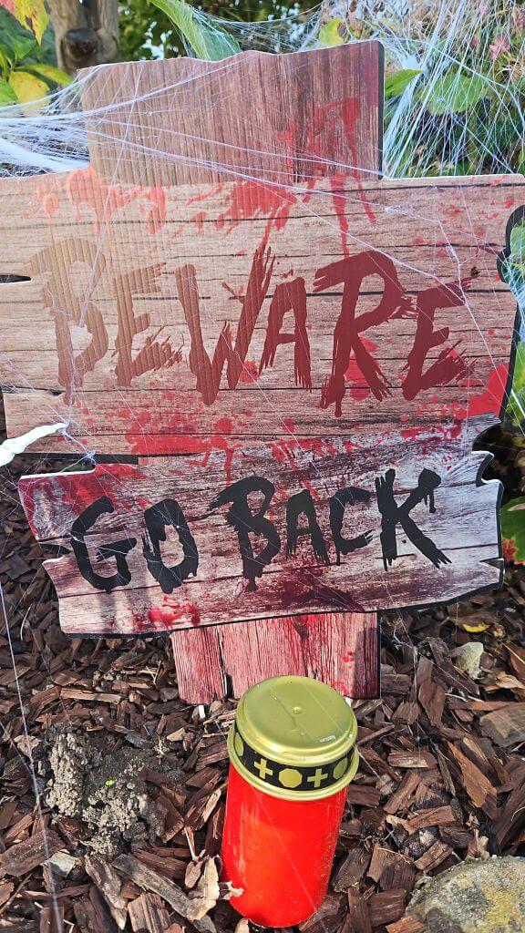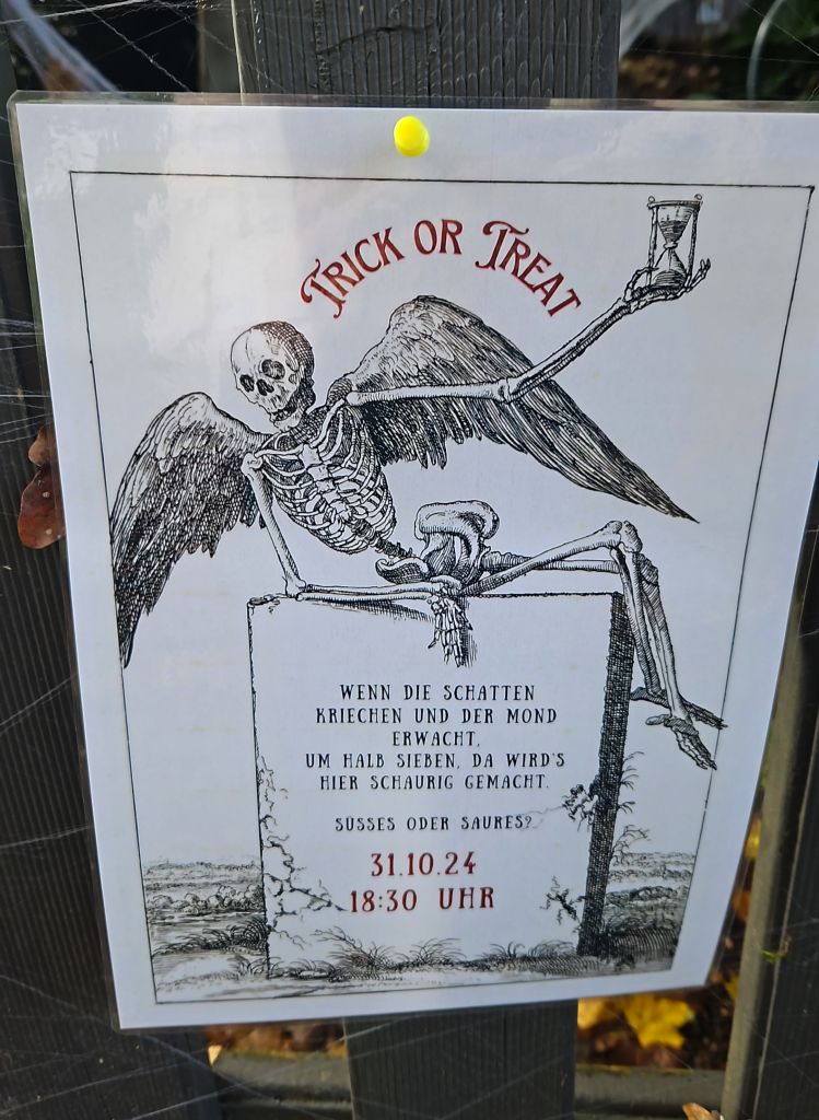 In der Fußgängerzone von Haan zieht eine „Halloween-Dangerzone“ die Aufmerksamkeit auf sich. Im Garten einer Familie verwandelt sich die Terrasse in eine „Walking Zombie Area“, die mit Warnschildern und schaurigen Figuren markiert ist. Ein Zombie und ein maskiertes Skelett „bewachen“ den Eingang, und eine Mumienfigur thront mit einem blutigen Kelch als Symbol für „Lebenselixier“ am Hintereingang. Diese kleine, aber feine Inszenierung schafft in Haan eine Attraktion, die den Besuchern Halloween in der City erlebbar macht.