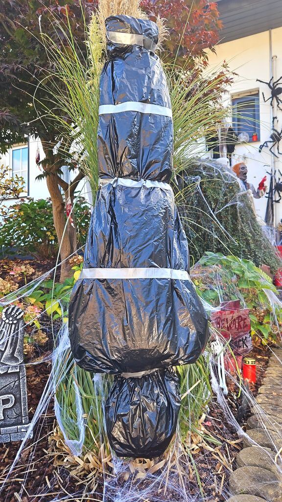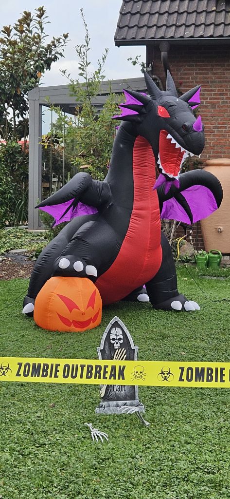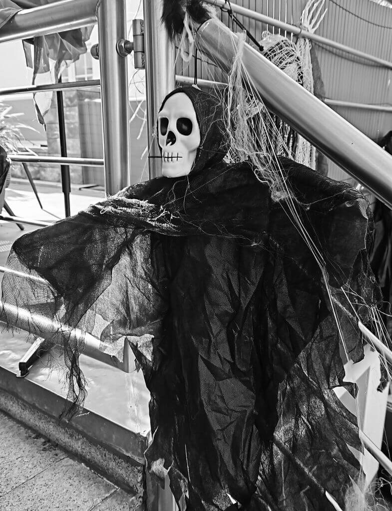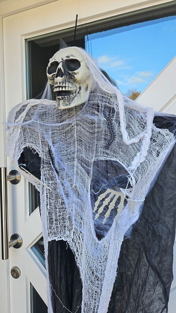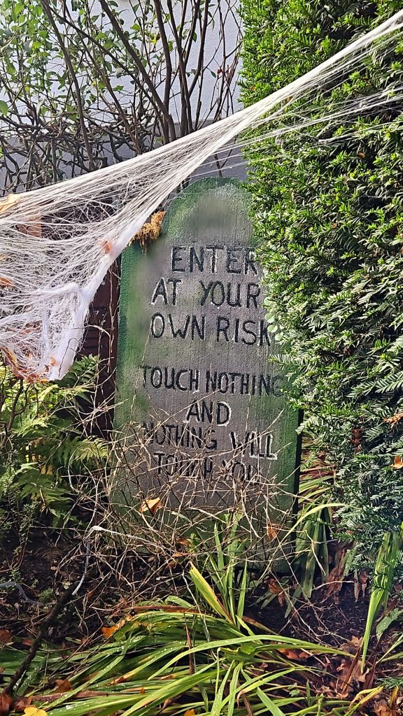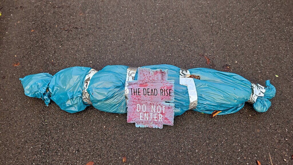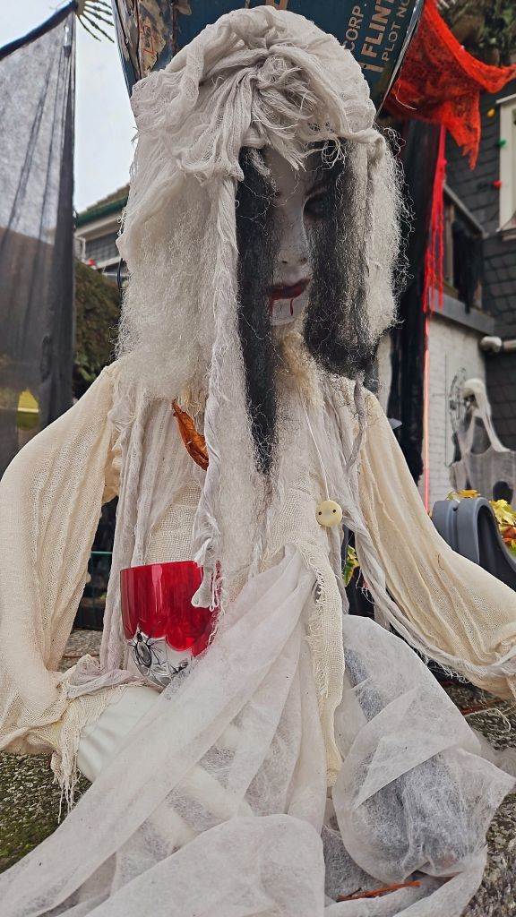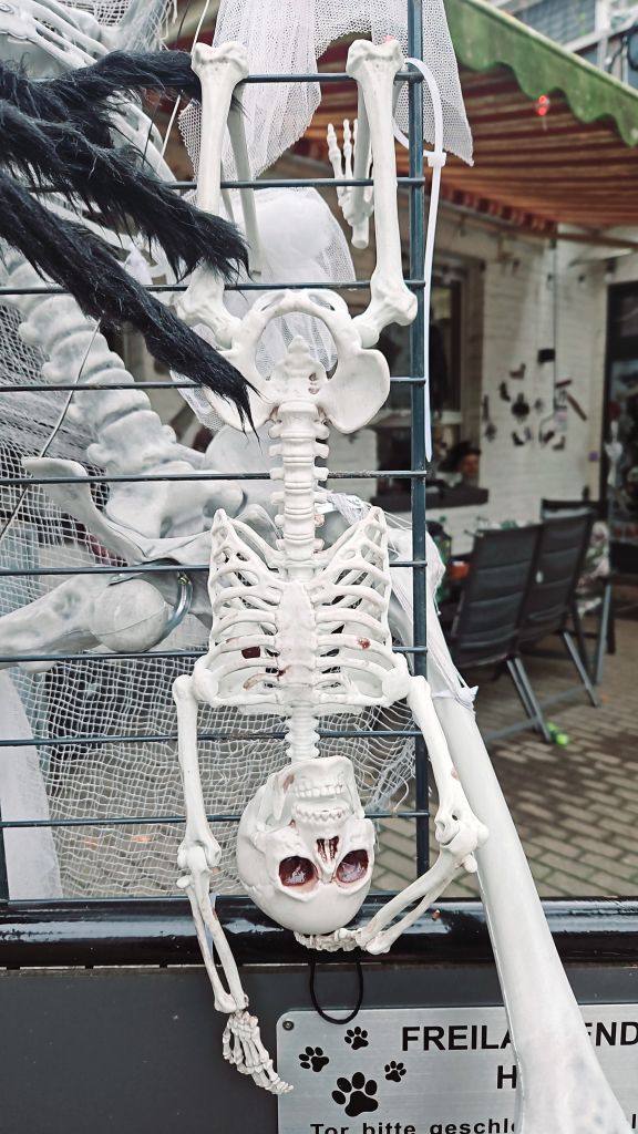 In der Fußgängerzone von Haan zieht eine „Halloween-Dangerzone“ die Aufmerksamkeit auf sich. Im Garten einer Familie verwandelt sich die Terrasse in eine „Walking Zombie Area“, die mit Warnschildern und schaurigen Figuren markiert ist. Ein Zombie und ein maskiertes Skelett „bewachen“ den Eingang, und eine Mumienfigur thront mit einem blutigen Kelch als Symbol für „Lebenselixier“ am Hintereingang. Diese kleine, aber feine Inszenierung schafft in Haan eine Attraktion, die den Besuchern Halloween in der City erlebbar macht.