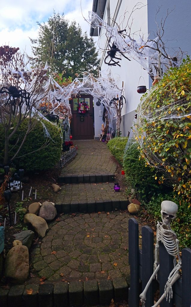 In Langenfeld-Wiescheid wird das Haus der Familie F. zum dritten Mal in eine Halloween-Landschaft verwandelt. Für die Familie hat der 31. Oktober eine besondere Bedeutung: Sie kamen an diesem Datum 2010 zusammen, weshalb Halloween zugleich ihr Jahrestag ist. Jedes Jahr überraschen sie die Nachbarschaft mit neuen Dekorationen, die Besucher jeden Alters begeistern. Besonders freut sich die Familie über die Kinder, die mit „Süßes oder Saures“ vor der Tür stehen und das Spukhaus bestaunen.