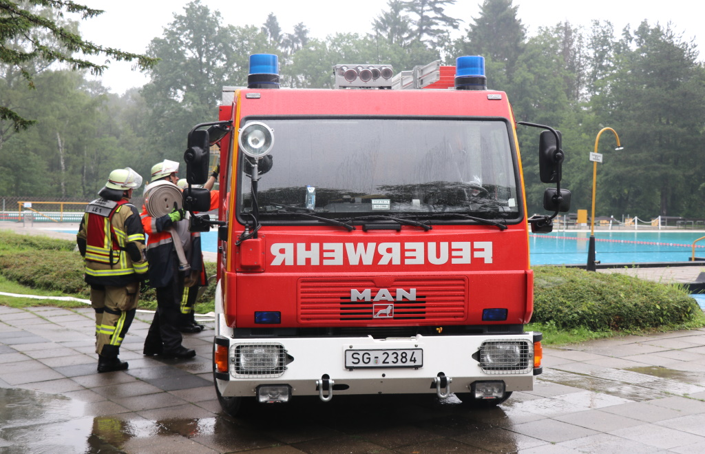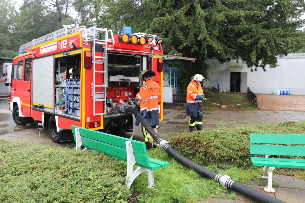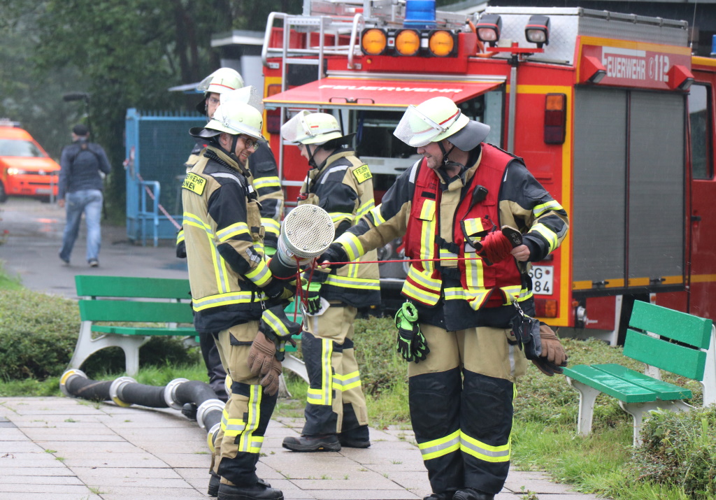 Die Feuerwehr ist im Einsatz, auch Fachleute der Technischen Betriebe, des Stadtdienstes Natur und Umwelt, der Unteren Wasserbehörde sowie der Hauselektriker sind vor Ort. Im Keller sind in sehr geringen Mengen auch Chemikalien vorhanden, mit denen das Beckenwasser aufbereitet wird, etwa Flockungsmittel und PH-Heber.