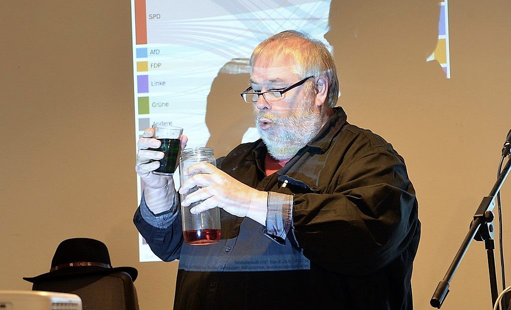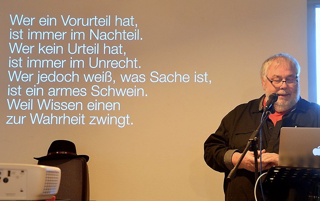 „Ich hatte schon lange mal wieder Kabarett machen wollen“, freute sich Wenke. „Mein ganzes Berufsleben lang habe ich mich gefragt: Wie lassen sich Menschen manipulieren?“ Seit vielen Jahren sammelt der Journalist, Autor und Fachmann für Medientechnologie Beispiele für den Umgang mit unserer Sprache, sei es im Alltag, in der Politik oder bei Publikationen.