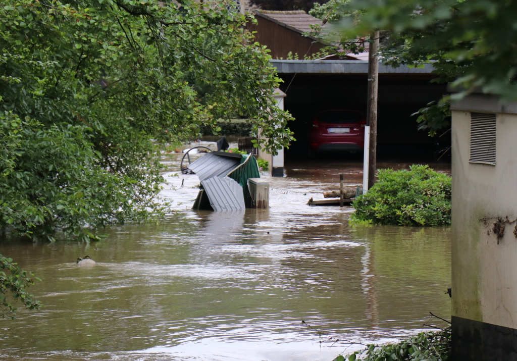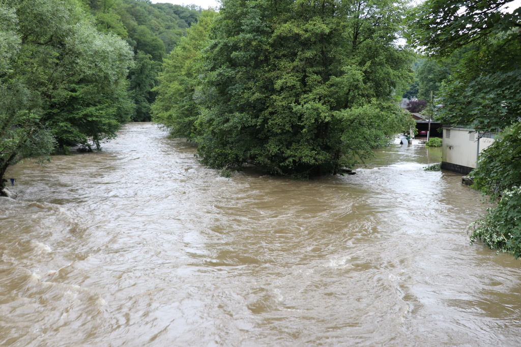 Die Situation in Unterburg ist nach wie vor angespannt, die Eschbachstraße steht unter Wasser. Inzwischen gibt es zahlreiche Hilfsangebotene für Betroffene. (Foto: © Bastian Glumm)