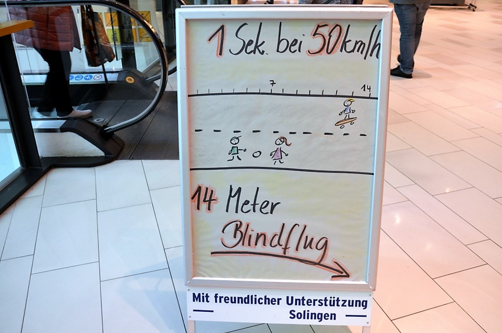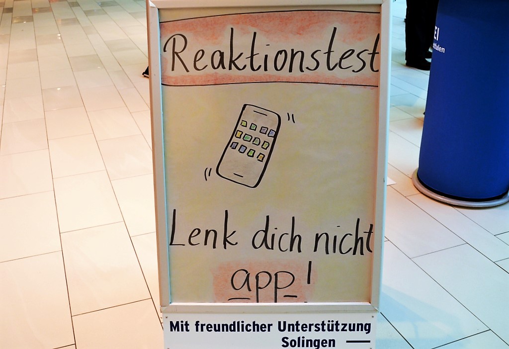 Das Team der Verkehrssicherheit Solingen stand im Erdgeschoss des Hofgartens vor dem TK Maxx, um mit den Bürgerinnen und Bürgern ins Gespräch zu kommen. Ein Reaktionstest lieferte in einer sehr anschaulichen Gegenüberstellung das Reaktionsvermögen mit und ohne Handy.