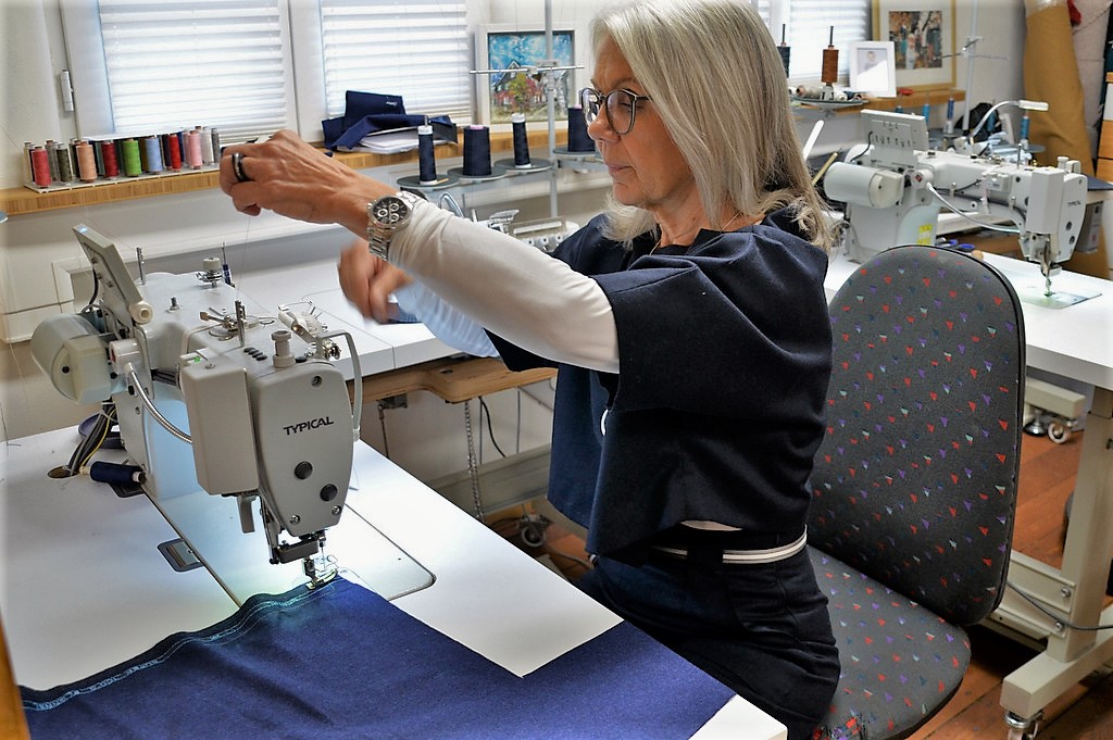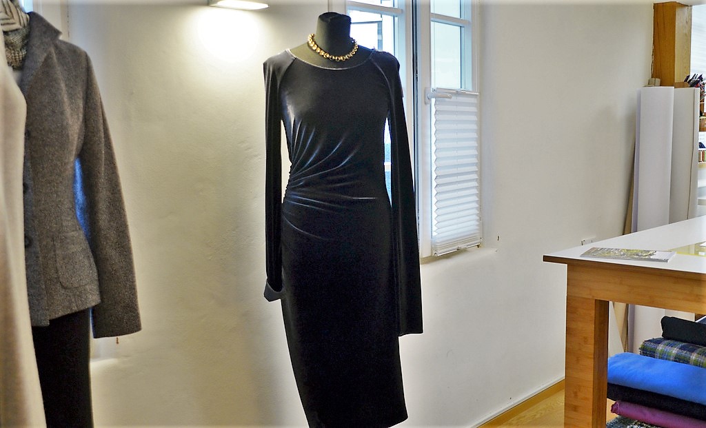 Auch Gudrun Herrmann geht ganz in ihrer Arbeit auf. Sie ist für die Stilberatung zuständig. „Ich wollte früher so gerne die Schneiderei erlernen“, erzählt sie. Die Mutter hatte viel genäht, und die Tante war gelernte Schneiderin. Doch die Eltern waren mit diesem Berufswunsch nicht einverstanden. So studierte sie Architektur und war im Anschluss daran viele Jahre im Marketing tätig. Doch für sich selbst hatte sie immer wieder Stücke genäht. „Kleidung muss nicht nur sitzen, sondern vor allem auch zur Person der Trägerin passen“, ist sie überzeugt. Ein Kleidungsstück für jemanden zu entwerfen, ist schon eine Vertrauenssache. Wer sich darin wohlfühlt, strahlt das auch nach außen. „Wir unterstützen unsere Kundinnen darin, ihren ganz persönlichen Stil zu finden.“ Dazu ist neben der Stilfindung viel Empathie erforderlich. „Wir sagen den Kunden auch ehrlich, wenn etwas gar nicht passt, wie beispielsweise ein unvorteilhafter Schnitt oder eine unpassende Farbe.“
