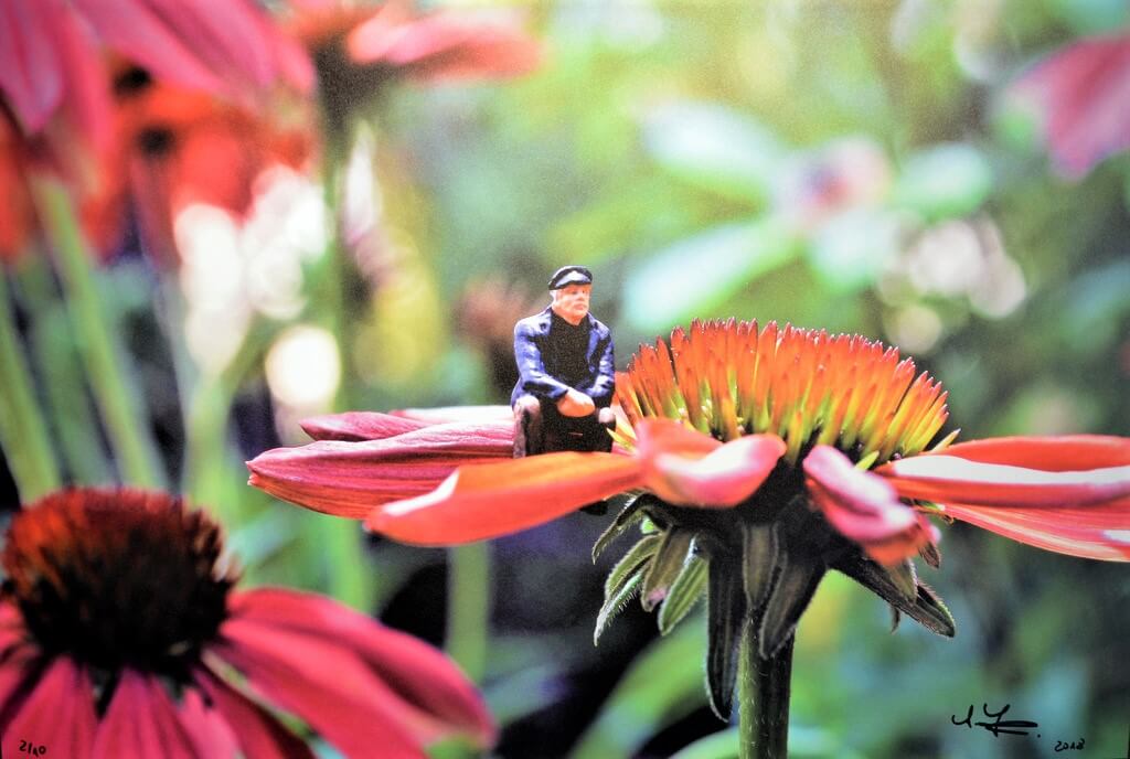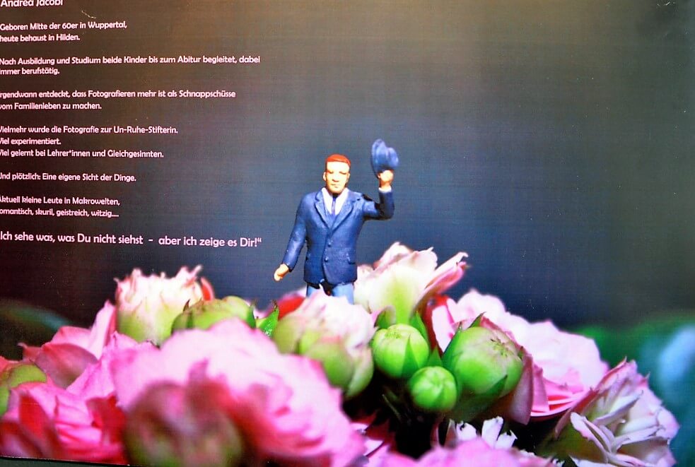 SOLINGEN (mh) – Der Mann auf der Echinacea -Blüte, der Hafenarbeiter zwischen den Gummibärchen, der Herr mit Hut, der nach einem Taxi winkt – die Fotografien von Andrea Jacobi ziehen sofort die Blicke der Betrachter auf sich. Die Hildener Fotografin setzt kleine Figuren im HO-Format aus der Welt der Modelleisenbahn gekonnt in Szene. Dabei spielt sie effektvoll mit dem Kontrast zwischen Groß und Klein.