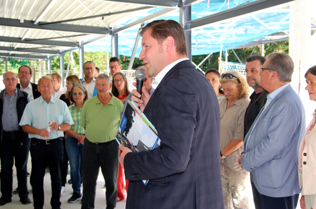 SOLINGEN (bgl) – Der den Becken vorgelagerte Eingangsbereich mit Umkleidekabinen des neuen Hallenbads Vogelsang ist bereits überdacht. Der Rohbau steht, so dass am Dienstag auf der Baustelle an der Focher Straße Richtfest gefeiert werden konnte. „Dass ein öffentlicher Bau voll im Zeit- und in Kostenplan ist, darf noch einmal ganz besonders unterstrichen werden“, betonte Oberbürgermeister Tim Kurzbach in seiner Ansprache. Die Eröffnung des neuen Hallenbads ist für das kommende Frühjahr vorgesehen. Rund neun Millionen Euro investiert die Stadt Solingen in das Familienbad. Eine Sanierung des maroden Vorgängerbaus sei nicht mehr rentabel gewesen.