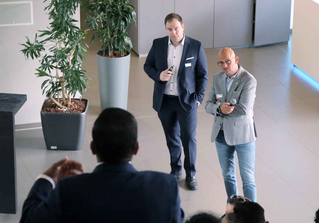 Sie erhielten zudem von Mitarbeiterinnen und Mitarbeitern der Orangery, die in dem Gebäude bald „attraktive und flexible Büroarbeitsplätze“ anbieten wollen, einen ersten Eindruck, welche Möglichkeiten hier geboten werden. Anschließend besuchte die Delegation das Industriemuseum der Gesenkschmiede Hendrichs inklusive englischsprachiger Führung sowie das Galileum Solingen.