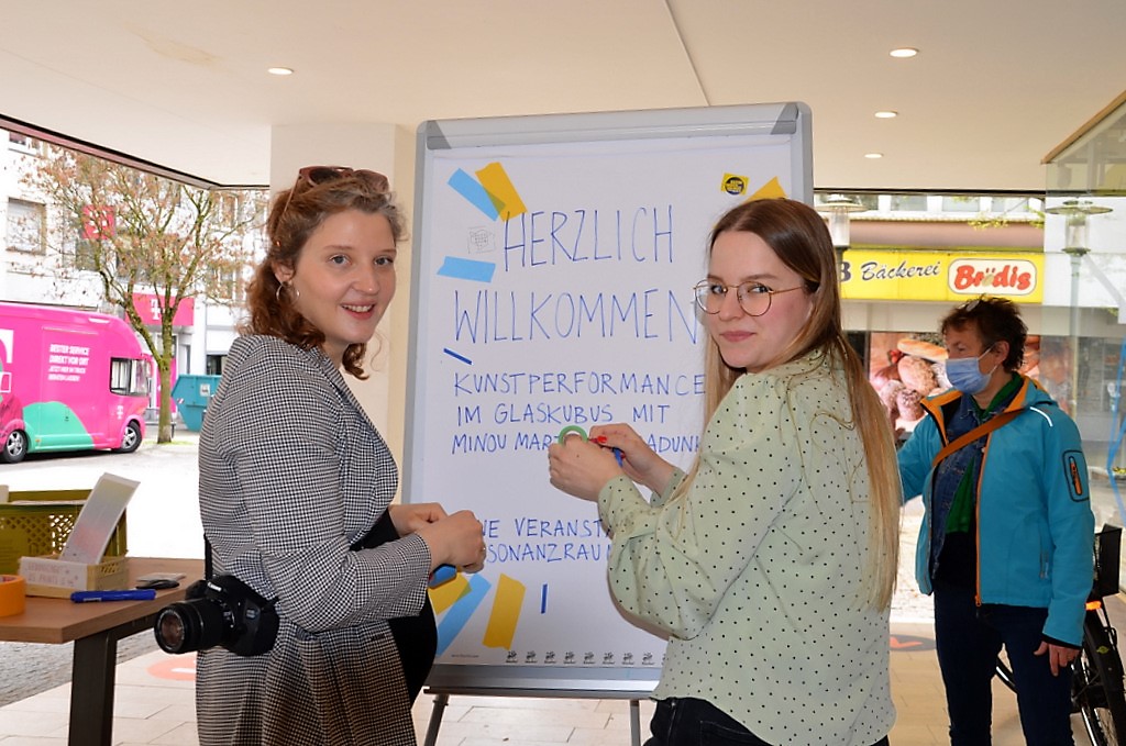 Hintergrund dieser Performance ist eine gemeinsame Aktion vom Resonanzraum Solingen und der Gläsernen Werkstatt, in der Zukunft und Perspektive für die Solinger Innenstadt mit Künstlerinnen und Künstlern gemeinsam entwickelt werden soll. Vor einigen Wochen hatte es im Rahmen eines Workshops verschiedene Utopien für Straßen und Plätze in der Innenstadt gegeben. Wie könnte ein konsumfreier Wohlfühlplatz aussehen? Die Ergebnisse sind auf einer großen Platte als Modell im Schaufenster zu sehen. Dabei entstand die Idee, den leeren Glaskubus durch ein performatives Kunstprojekt zu beleben.