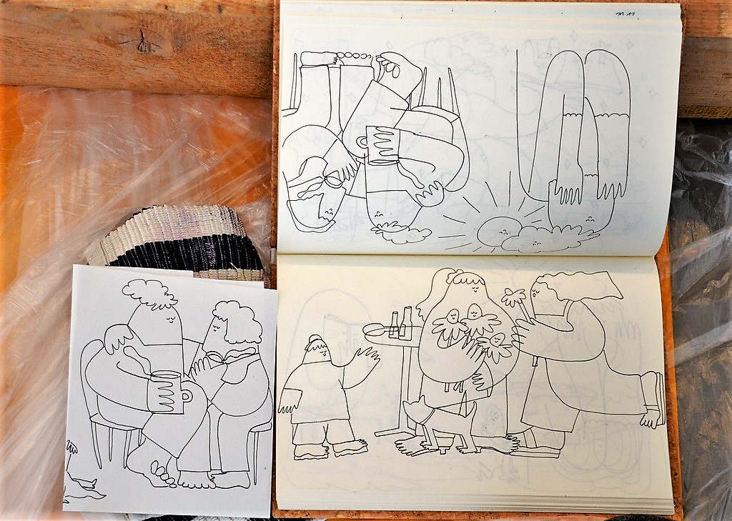Künstlerkollegin Rahel Haack (Künstlername Radunkel) zeichnet gerne weiche Charaktere. Mit Acryl und Pinsel hielt sie Illustrationen nach vorher angefertigten Skizzen auf den Scheiben fest. Bei ihrer Arbeit geht es viel um die möglichen Formen des menschlichen Miteinanders. „Ich zeichne gerne figürlich. Für diese Performance habe ich menschliche Charaktere gewählt, die das gesellige Miteinander aufzeigen: Zwei Leute bei einer Tasse Kaffee, zwei Frauen mit Hund, ein kleiner Junge, der gerne Tischtennis spielen möchte – einfach das gesellige Leben. Meine Modelle sollen nicht perfekt sein, sondern das Abbild der Gesellschaft darstellen. Der Betrachter soll sich mit ihnen interpretieren, vor allem auf die Stimmung und das gute Gefühl bezogen.“
