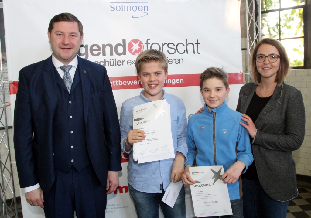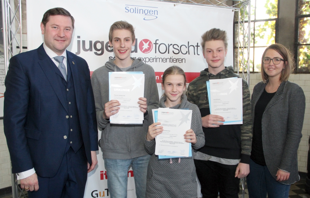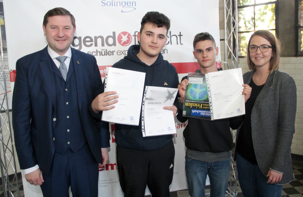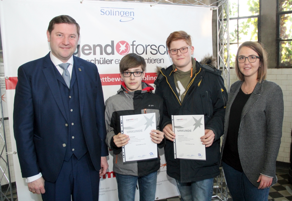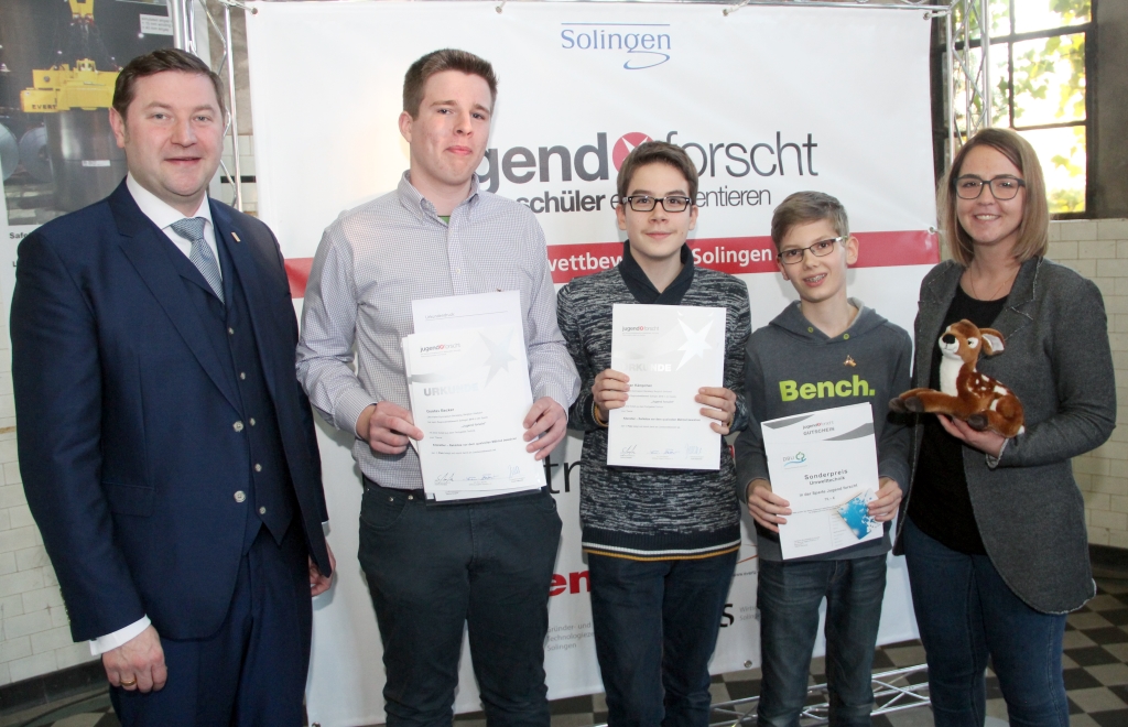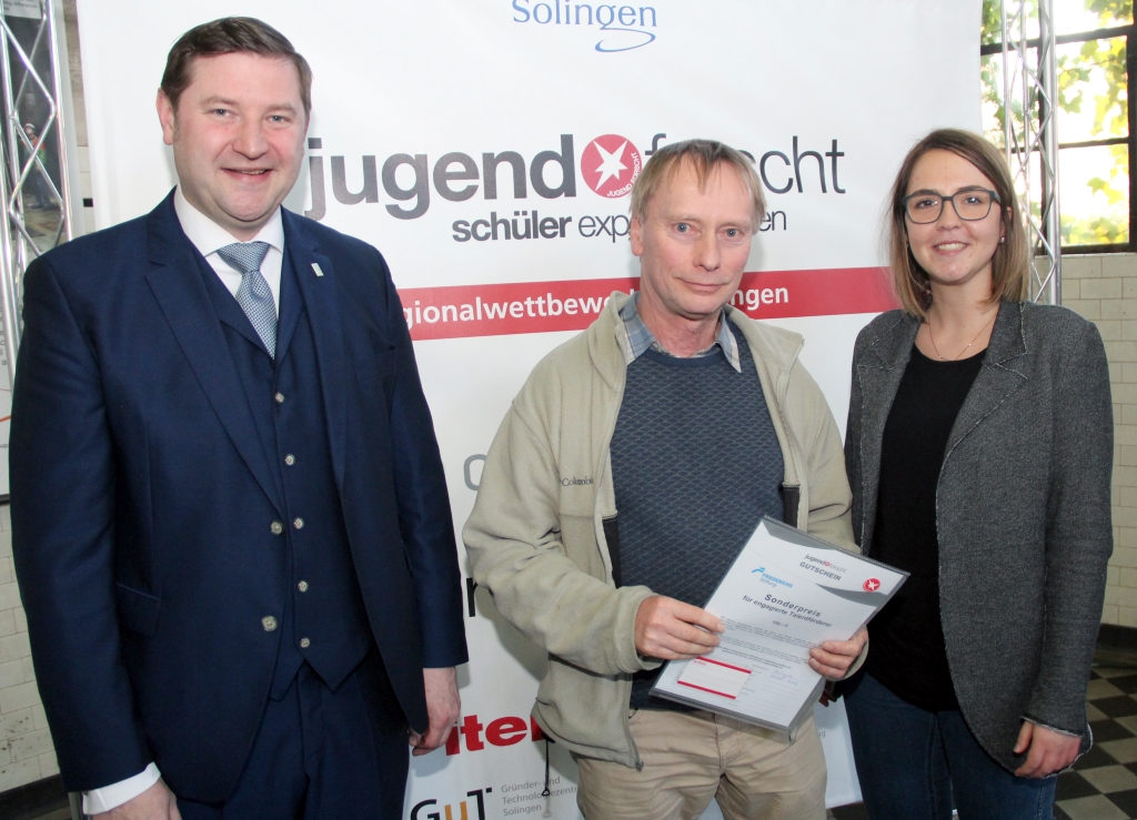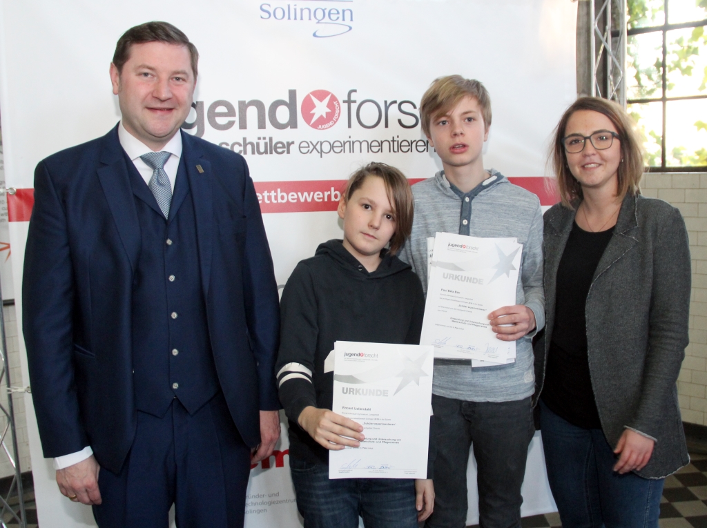 Am späten Nachmittag wurden alle Teilnehmer von Oberbürgermeister Tim Kurzbach und Wettbewerbsleiter Sascha Bergfeld, Lehrer am Humboldtgymnasium Solingen, geehrt. Die Jungforscher, die die Jury in besonderem Maße beeindruckten, wurden zudem mit Sonderpreisen oder der Teilnahme am Landeswettbewerb von Jugend forscht ausgezeichnet. Auch in diesem Jahr hat OB Kurzbach im Rahmen der Feierstunde wieder vier Solinger Schulen den Solinger „Jugend forscht Schul-Sonderpreis“ überreicht.