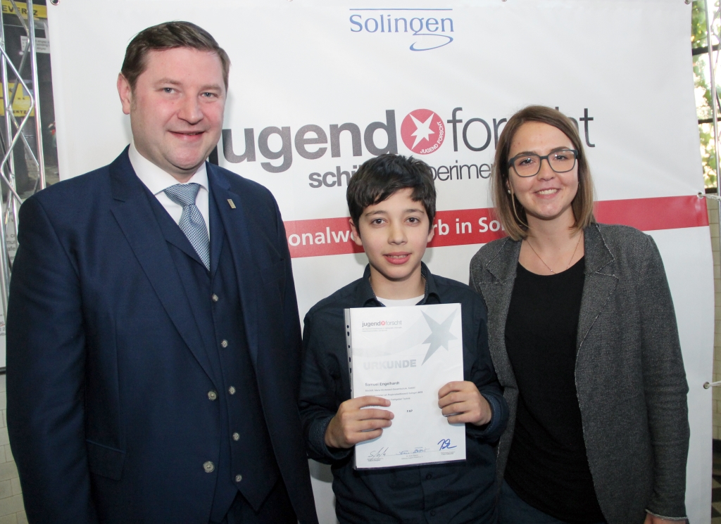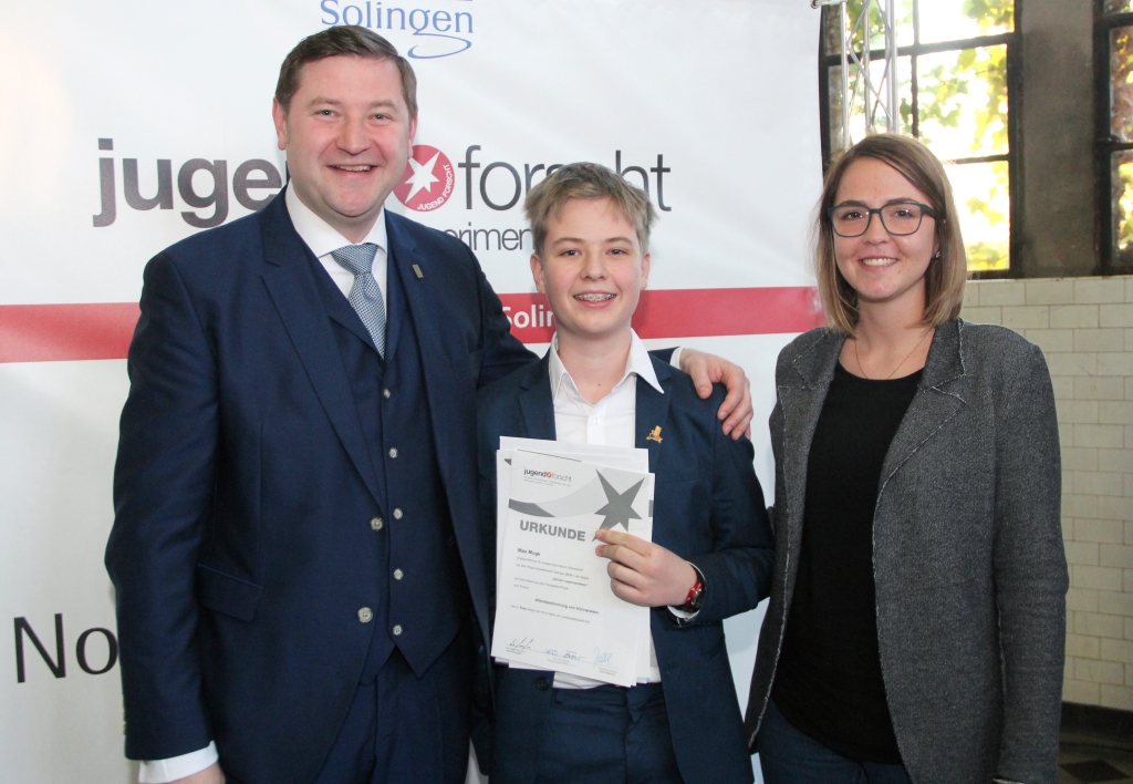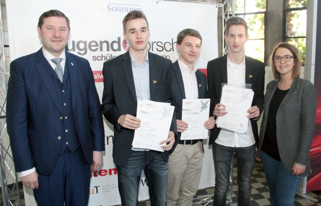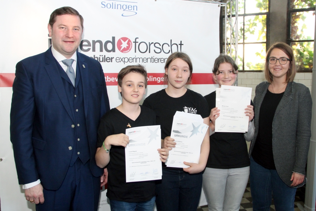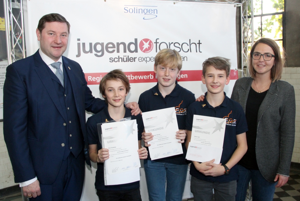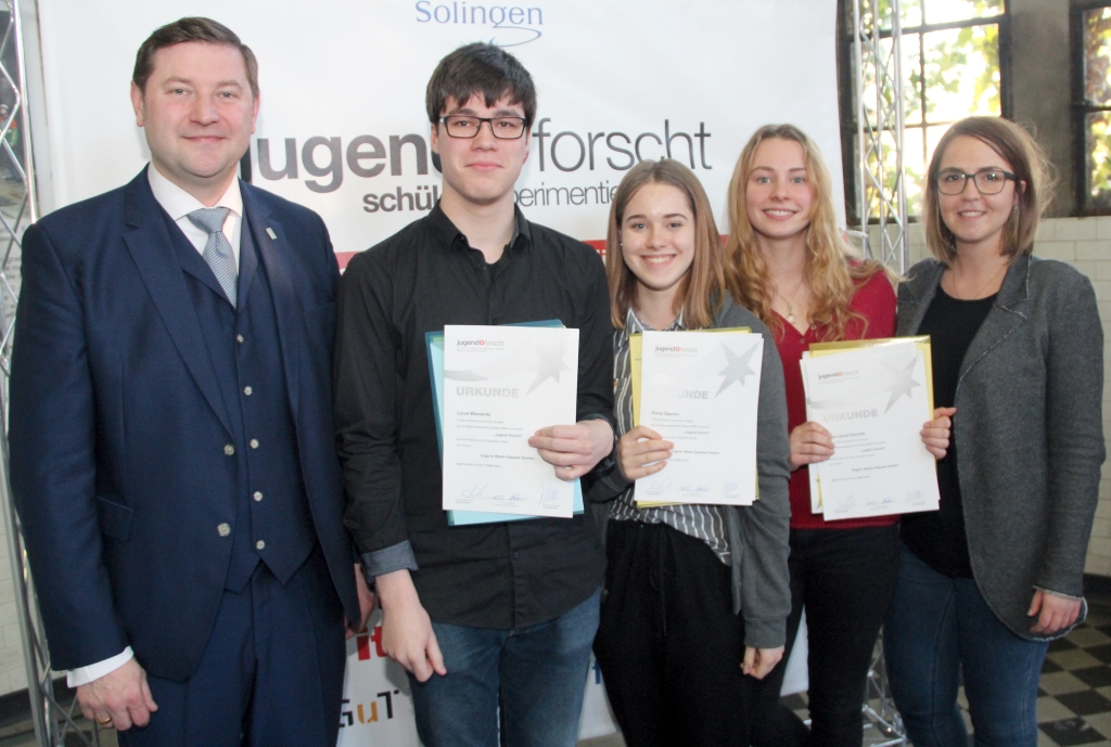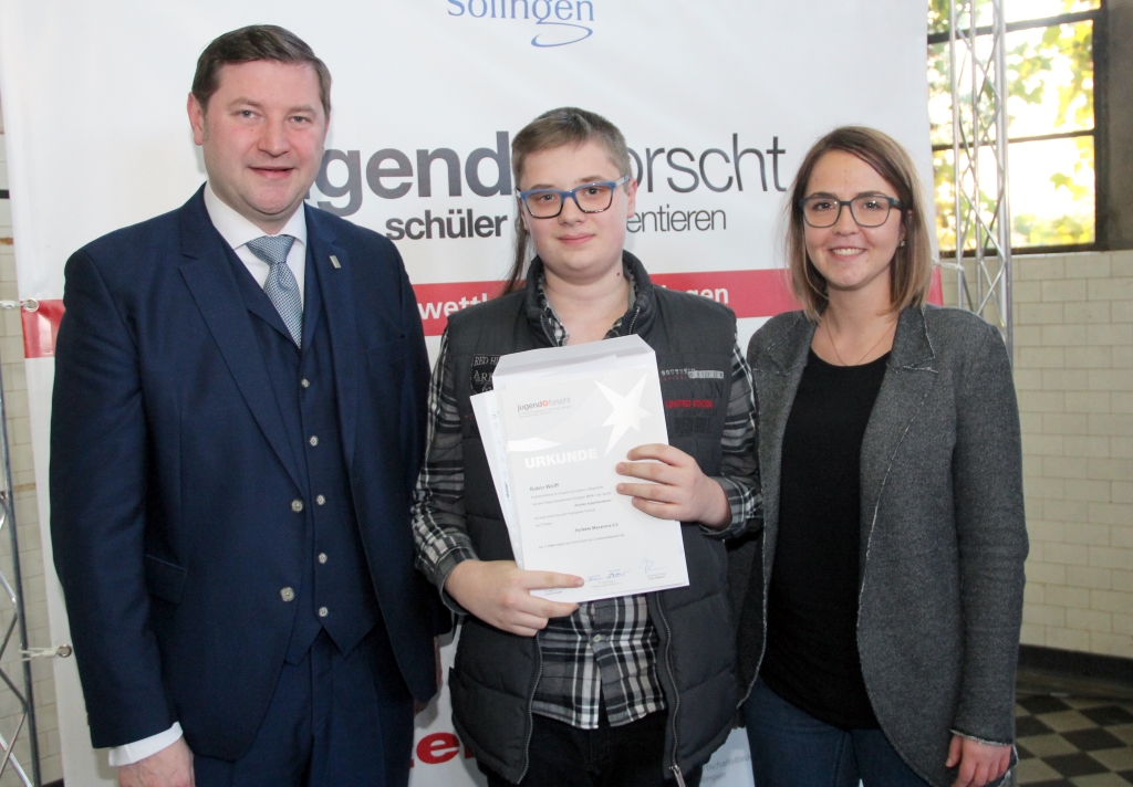 Am späten Nachmittag wurden alle Teilnehmer von Oberbürgermeister Tim Kurzbach und Wettbewerbsleiter Sascha Bergfeld, Lehrer am Humboldtgymnasium Solingen, geehrt. Die Jungforscher, die die Jury in besonderem Maße beeindruckten, wurden zudem mit Sonderpreisen oder der Teilnahme am Landeswettbewerb von Jugend forscht ausgezeichnet. Auch in diesem Jahr hat OB Kurzbach im Rahmen der Feierstunde wieder vier Solinger Schulen den Solinger „Jugend forscht Schul-Sonderpreis“ überreicht.