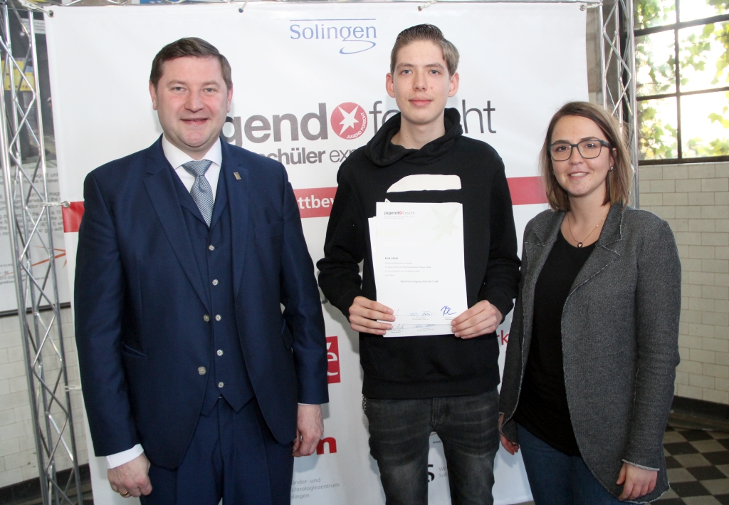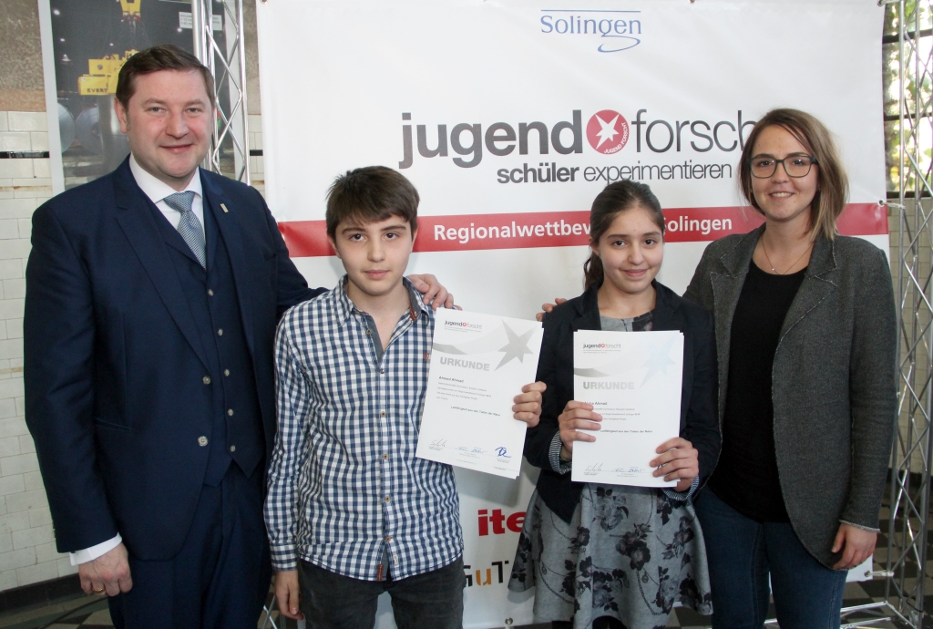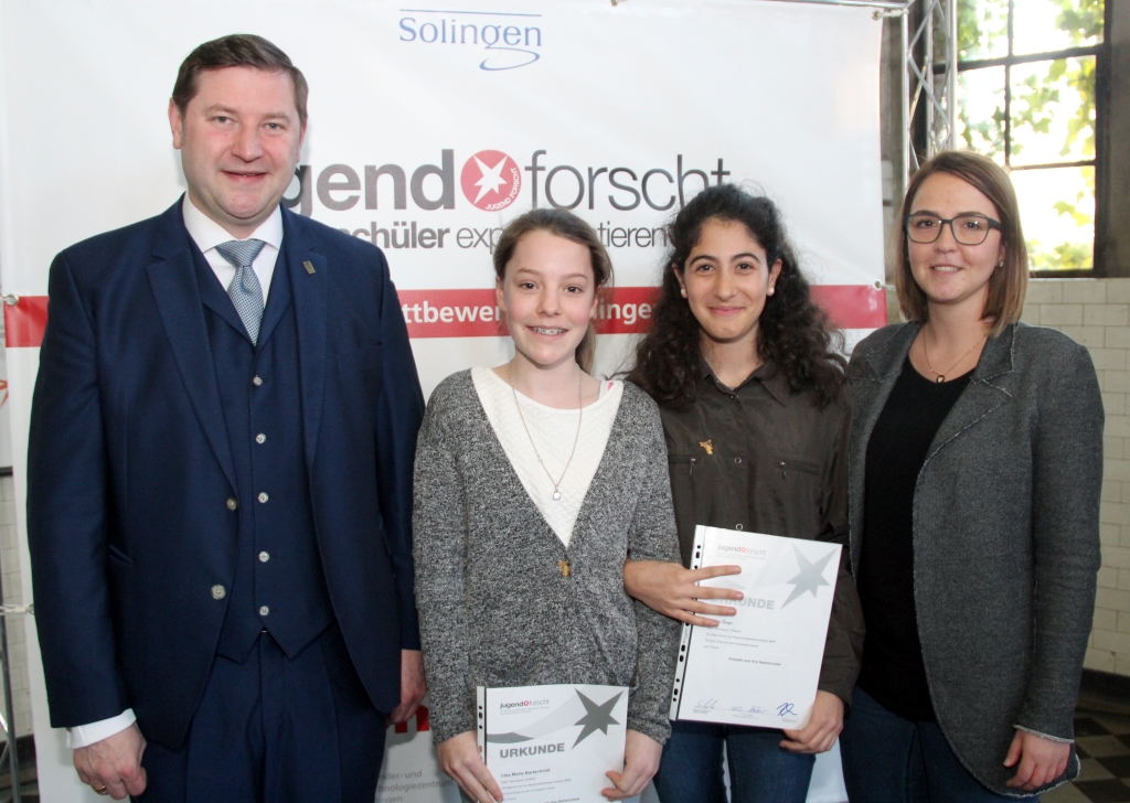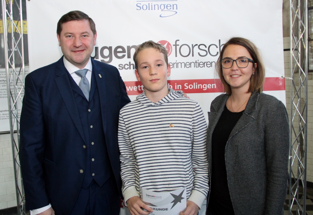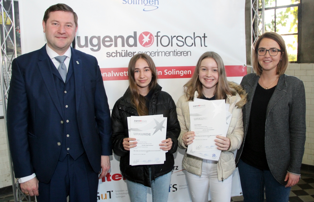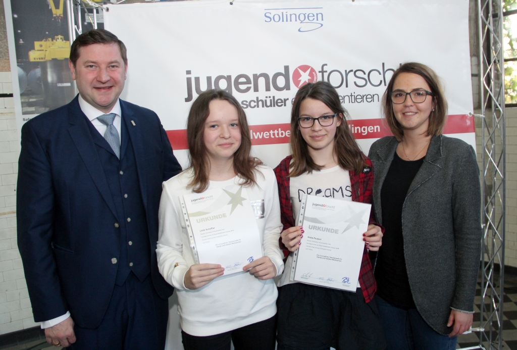 Am späten Nachmittag wurden alle Teilnehmer von Oberbürgermeister Tim Kurzbach und Wettbewerbsleiter Sascha Bergfeld, Lehrer am Humboldtgymnasium Solingen, geehrt. Die Jungforscher, die die Jury in besonderem Maße beeindruckten, wurden zudem mit Sonderpreisen oder der Teilnahme am Landeswettbewerb von Jugend forscht ausgezeichnet. Auch in diesem Jahr hat OB Kurzbach im Rahmen der Feierstunde wieder vier Solinger Schulen den Solinger „Jugend forscht Schul-Sonderpreis“ überreicht.