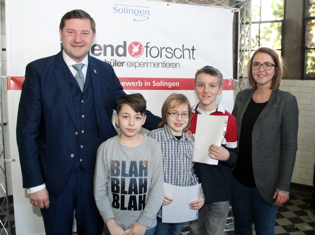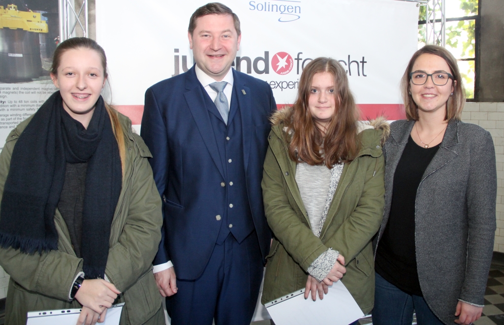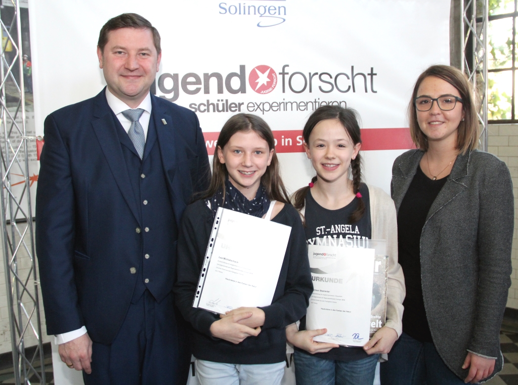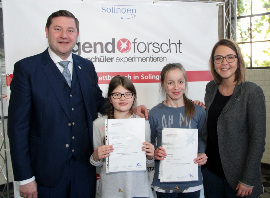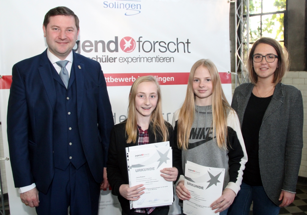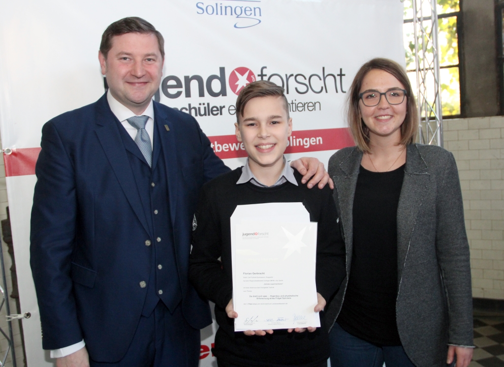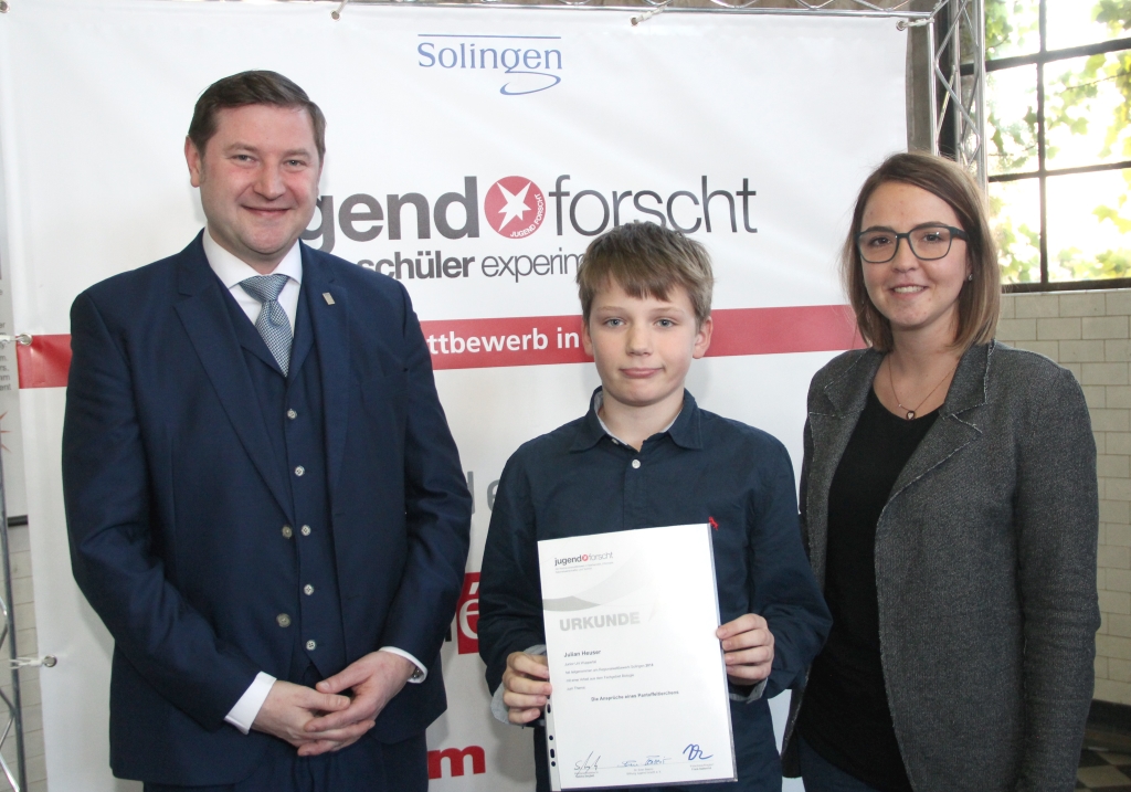 Am späten Nachmittag wurden alle Teilnehmer von Oberbürgermeister Tim Kurzbach und Wettbewerbsleiter Sascha Bergfeld, Lehrer am Humboldtgymnasium Solingen, geehrt. Die Jungforscher, die die Jury in besonderem Maße beeindruckten, wurden zudem mit Sonderpreisen oder der Teilnahme am Landeswettbewerb von Jugend forscht ausgezeichnet. Auch in diesem Jahr hat OB Kurzbach im Rahmen der Feierstunde wieder vier Solinger Schulen den Solinger „Jugend forscht Schul-Sonderpreis“ überreicht.