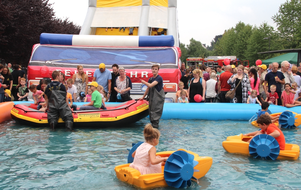 SOLINGEN (bgl) – Im Südpark schlug so manches Kinderherz am Samstagnachmittag höher. Kein Wunder, erfüllten sich für den einen oder anderen kleinen Besucher des 4. Kinder-Feuerwehrfestes doch lang gehegte Wünsche. Was sonst bestenfalls nur in der Theorie möglich ist, konnten die Kids jetzt selbst und hautnah erleben. Kleine Feuer löschen? Das war möglich, freilich unter fachkundiger Anleitung der Angehörigen der Löscheinheiten der Freiwilligen Feuerwehr.