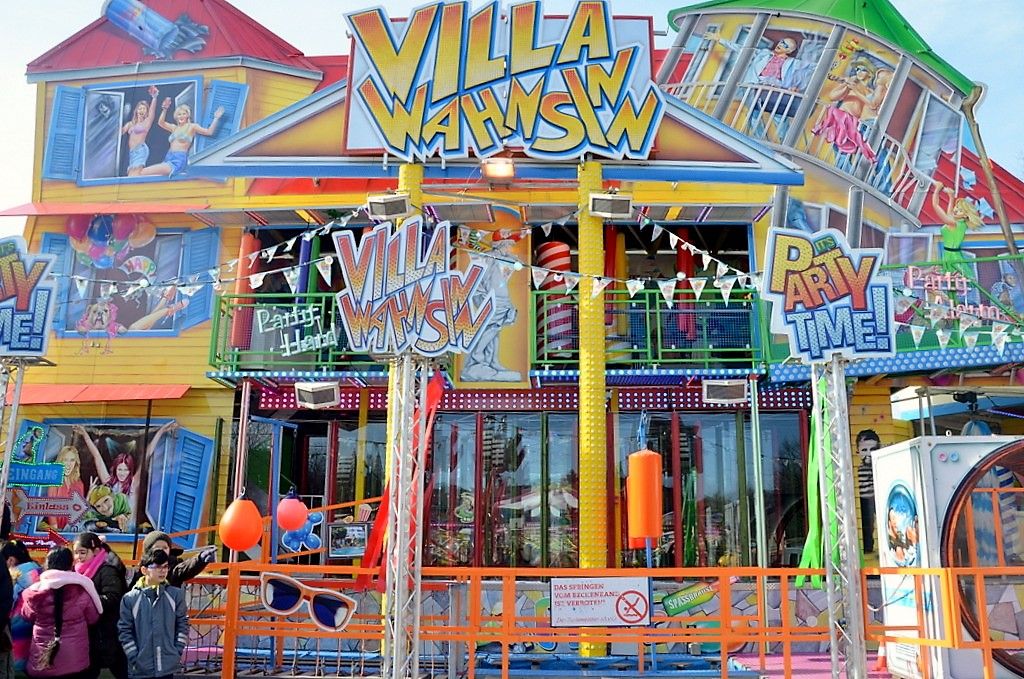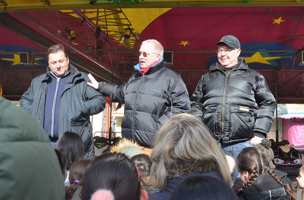 Markus von Olnhausen, Schausteller in der sechsten Generation, wartete schon an der Villa Wahnsinn. Das kuriose Spaßhaus bietet im Inneren auf zwei erlebnisreichen Etagen drehbare Wackelbrücken, Expanderlabyrinth, Spiegelkabinett und eine goldene Tonne. Der Clou sind die Wasserspiele vor der Anlage. Die blieben heute aber aufgrund der Temperaturen außer Betrieb. Der Schausteller hat den größten Teil der Anlage selbst gebaut. „Die Villa Wahnsinn ist ein Lauf- und Bewegungsgeschäft“, erklärte er den staunenden Zuhörern. „Sie ist 2014 unter ökologischen Gesichtspunkten entstanden. Es gibt nur LED-Beleuchtung und damit einen ganz geringen Stromverbrauch.“ Im Vergleich verbraucht die Anlage täglich 60 kW, ein Camping-Wohnwagen durchschnittlich 20 kW. In etwa anderthalb Tagen ist das Spaßhaus aufgebaut. Jeden Morgen dauert es fast eine Stunde, bis die vielen Glasscheiben geputzt sind. In die Anlage wurde die stattliche Summe von 350.000 Euro investiert.