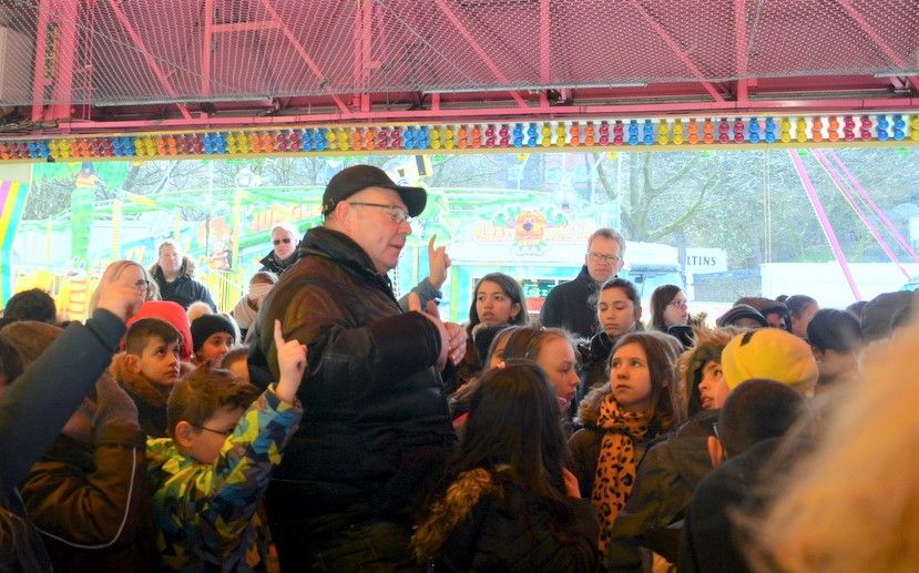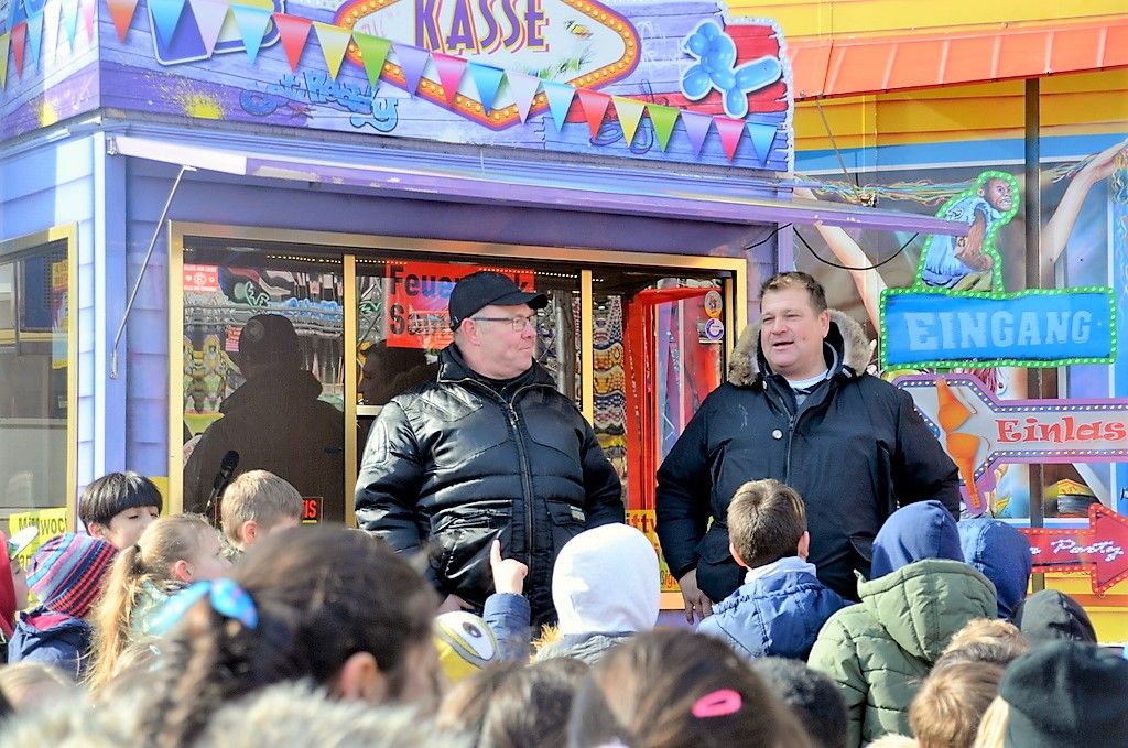 Der Bezirksbürgermeister begrüßte die vier Klassen mit ihren Klassenleitungen als die ersten Gruppen, die an dem Projekt teilnehmen konnten. Und dann standen rund 100 Kinder vor den Schaustellern, die ausführlich und kindgerecht zahlreiche Fragen beantworteten.