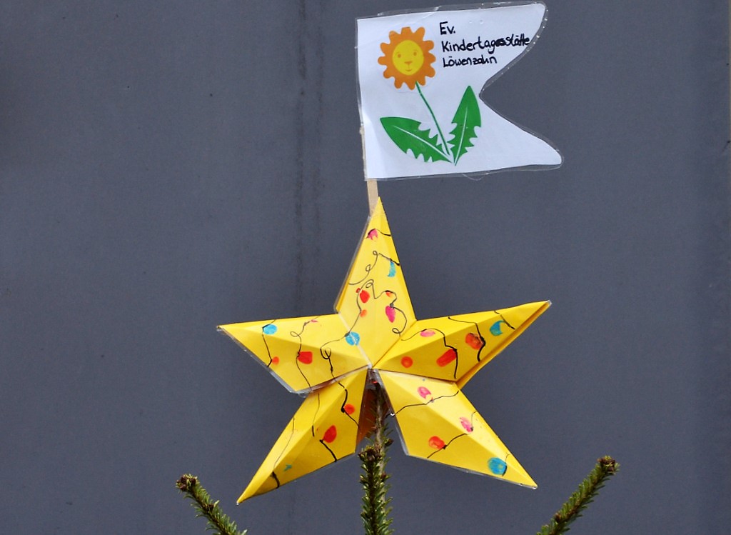 Da sich die Spitze des Baumes trotz Unterstützung nicht von den Kindern erreichen ließ, stieg Polizeichefin Claudia Schepanski kurzerhand selbst auf die Leiter und platzierte den großen gelben Stern am höchsten Punkt. Die weitere künstlerische Gestaltung erledigten die Kinder der Evangelischen Kita Löwenzahn aber selbst.