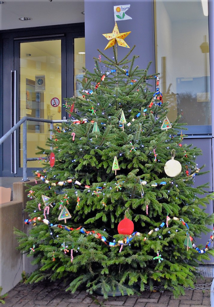 Die schon vorab mit einer Lichterkette geschmückte voluminöse Tanne wurde Stück für Stück mit selbstgebastelter Dekoration verschönert. Während die einen noch etwas zögerlich schauten, griffen andere sofort zu dem zauberhaften und mit viel Liebe gebastelten Schmuck und hängten alles flugs in die Zweige. Mit einer Menge Spaß und vor Eifer roten Bäckchen nahmen sie Stück für Stück aus den Händen der Kita-Mitarbeiterinnen entgegen. Das Aufhängen der rund zehn Meter langen, in bunten Farben leuchtenden Girlande übernahm Kita-Leiterin Bea Bianco dann aber doch in Eigenregie.