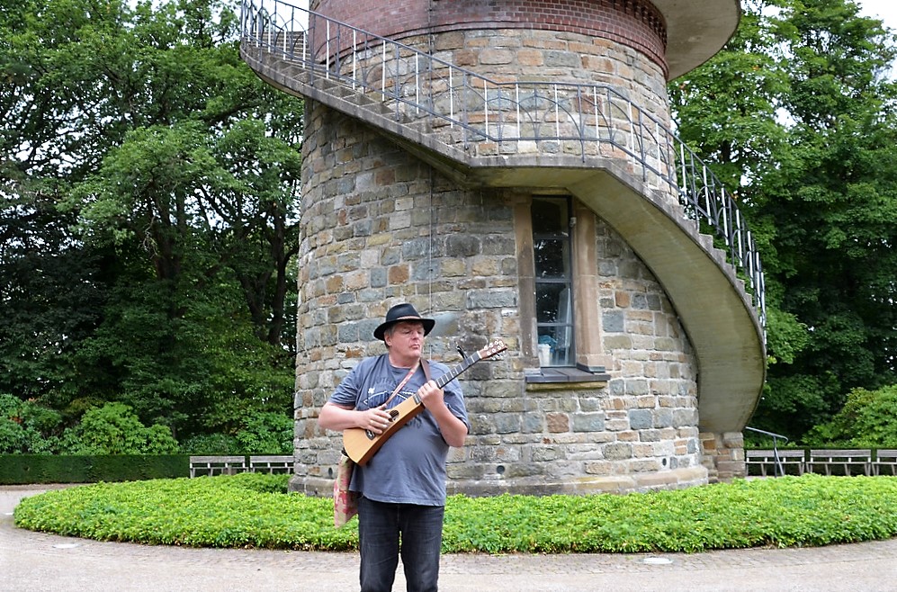 Während der gesamten Wanderung unterhielt Spielmann Michel, der zeitreisende Musikus, mit lustigen und zugleich sozialkritischen Liedern. Der preisgekrönte Multiinstrumentalist, mit bürgerlichem Namen Michael Völkel, spielt neben der Gitarre auch Waldzither, Ukulele, Flöte, Dudelsack und mehr. Seit kurzem ist er ebenfalls als Autor erfolgreich. So unterhielt er nicht nur musikalisch, sondern auch mit einem Auszug aus seinem neuesten Werk.