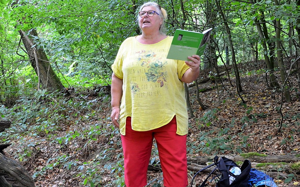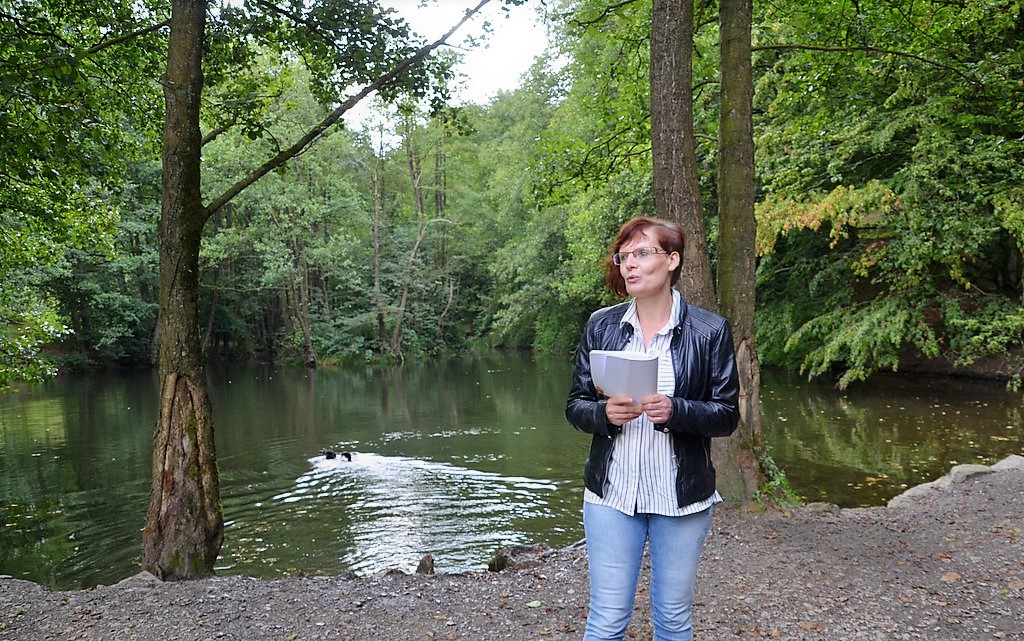 An einem anderen großen Teich berichtete die Wuppertalerin Martina Sprenger von einer Zugfahrt, dem Verschwinden eines Schlüsselbundes und einer unangenehmen Schwiegermutter. Das unerwartete Ende sorgte für viel Amüsement bei den Zuhörern. Sprenger ist ein immer wieder gern gesehener Gast bei den Wandertagen.