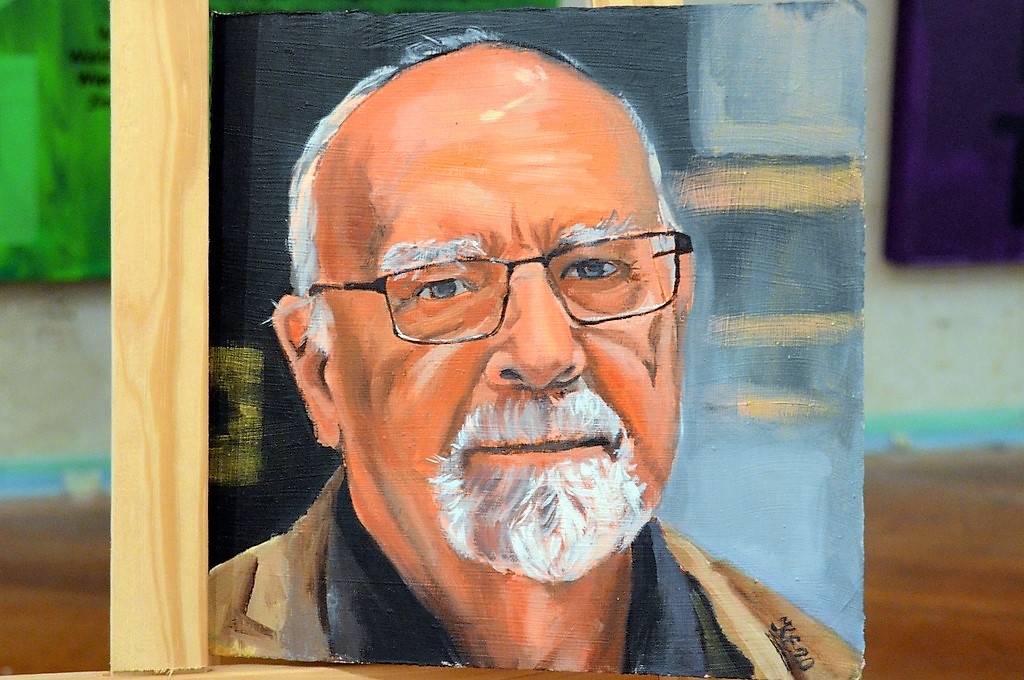 Die Kollegen zeigten sich nur zu gerne bereit, Kristina Eckel zu unterstützen. Nach Fotovorlage malt die Künstlerin ihre Porträts in Öl auf Pappwabenplatte. „Keilrahmen waren mir zu langweilig“, gesteht sie. Holzplatten wären ebenfalls möglich gewesen, aber vom Gewicht her natürlich um einiges schwerer. Die originellen 25 x 25 cm großen Pappwabenplatten, die den Darstellungen das gewisse Etwas geben, werden zunächst mit einer Gesso-Grundierung bearbeitet, bevor darauf das jeweilige Konterfei in Öl abgebildet wird.