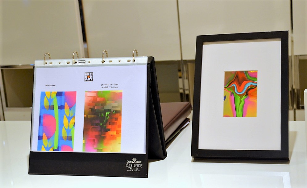 Hat der Besucher die Fahnen passiert, finden sich gleich dahinter Digital-Druck-Grafiken von Klaus Dreikausen. Der Organisator war über 30 Jahre im grafischen Bereich tätig. Die dabei gewonnen Erfahrungen setzt er jetzt mit Hilfe der unzähligen Möglichkeiten der Computergrafik kreativ um. Mittlerweile finden sich rund 2000 Exponate in seinem Fundus. Seine Arbeiten leben von der Kombination brillanter Farben in einem ganz besonderen Schaffensprozess. „Meine Motive sollen jung, dynamisch und farbenfroh wirken.“ Neben seinem Standardformat 30 x 40 cm hängen in den ehemaligen Umkleidekabinen Motive in Farbvarianten. Dreikausen hat eine Vorliebe für diese spezielle Darstellung. „Solche Farbvarianten können einen tollen Effekt hervorrufen.“