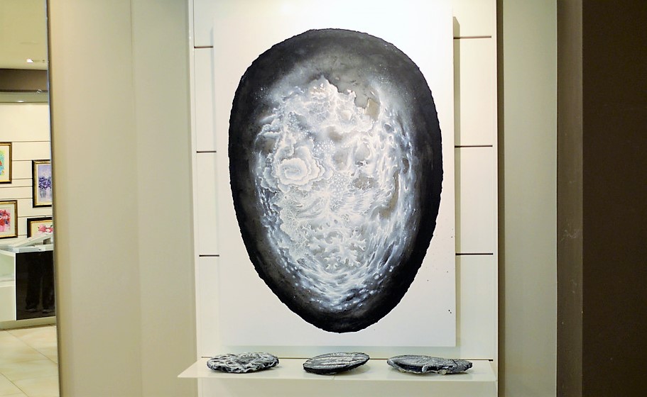 Als einziger Künstler stellt der 1979 in Vietnam geborene Tuan Anh Do sowohl Malerei als auch Skulpturen aus. Auf Formen aus Beton irren Menschen im Inneren eines Körpers durch ein Geflecht von Blutgefäßen, Venen, Adern. Eine Raupe mit menschlichem Gesicht schlängelt sich vorwärts. Über diesen etwas düsteren Ansichten hängt ein großer Keilrahmen mit schwarz-weißer Darstellung. „Das unberührte Land“ lässt das Asiatische ahnen, wirkt im Gegensatz zu den drei Betonarbeiten wesentlich lebensfroher.