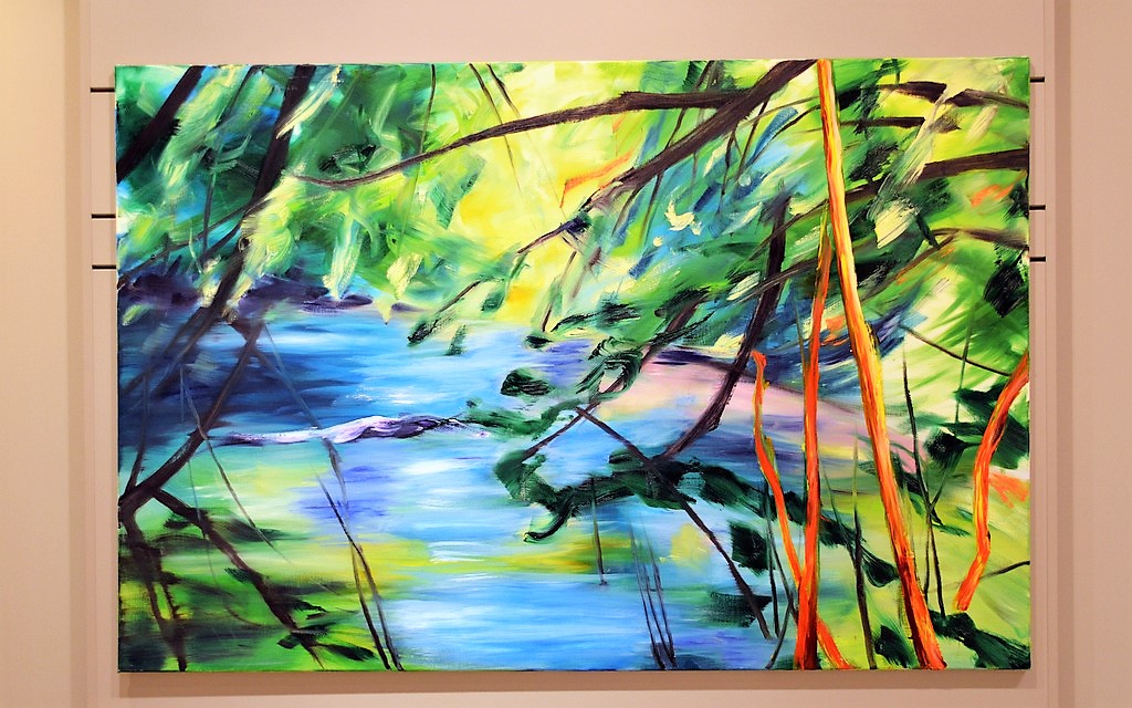 Beeindruckend sind vor allem Mauels Tanzmotive. Schemenhaft dargestellte Tänzerinnen in leuchtend roten Kleidern versprühen Energie. Daneben als Hommage eine Darstellung von Pina Bausch. Das Werk „Blattwirbel“ ist ein absoluter Hingucker. Die orangefarbenen Bäume im Vordergrund erzeugen eine Darstellung mit großer Tiefenwirkung.