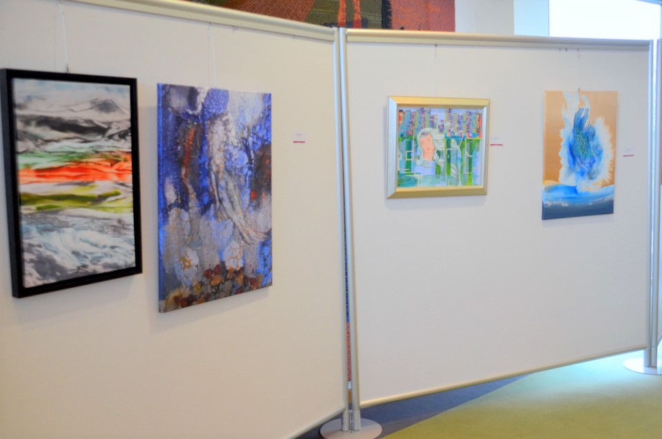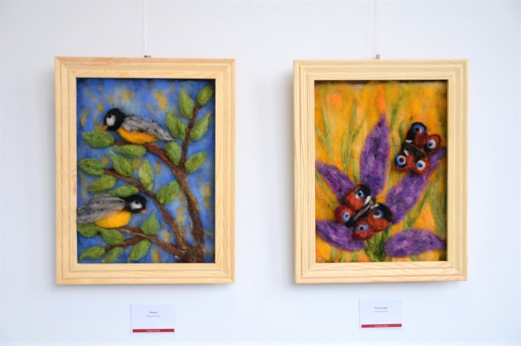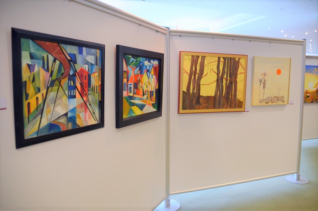 Auch die Malgruppe des Gerhard-Berting-Hauses war beim 30-jährigen Jubiläum mit acht Bildern dabei. Andrea Peter vom Sozialen Dienst und Sabine Schulz-Wohl, die seit Jahren die Malgruppe ehrenamtlich betreut, sind stolz auf ihre begabten Teilnehmer. (Foto: © Martina Hörle)