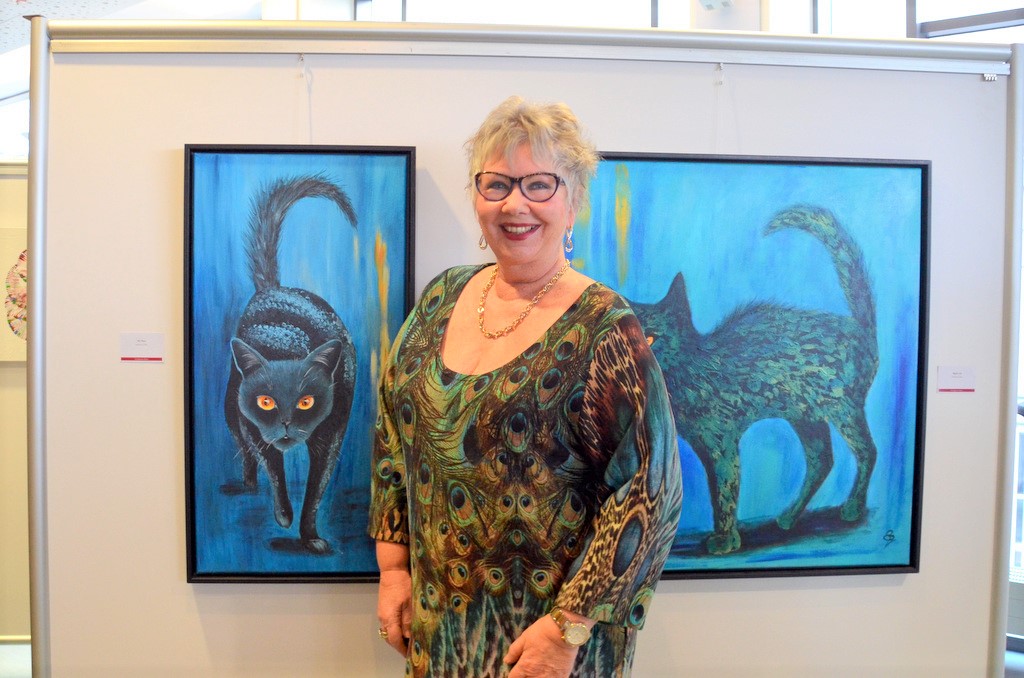 Ingeborg Saes nimmt bereits zum fünften Mal bei „Kunstgenuss 60plus“ teil. In diesem Jahr hat sie zwei leuchtend blaue Katzenbilder mitgebracht. „Mit diesem Blau wollte ich Farbe und Lebendigkeit wecken.“ Saes malt ausschließlich in Acryl. Auch Irmgard Stohlmann ist Wiederholungstäterin. Ihr leuchtend rotes Bild erweckt den Anschein, als ob jeden Moment etwas in Flammen aufgeht. Das blaue daneben strahlt Kälte aus. Dabei stellt es laut der Künstlerin Geysire im Yellowstone-Nationalpark dar. Und die sind ja bekanntlich alles andere als kalt.