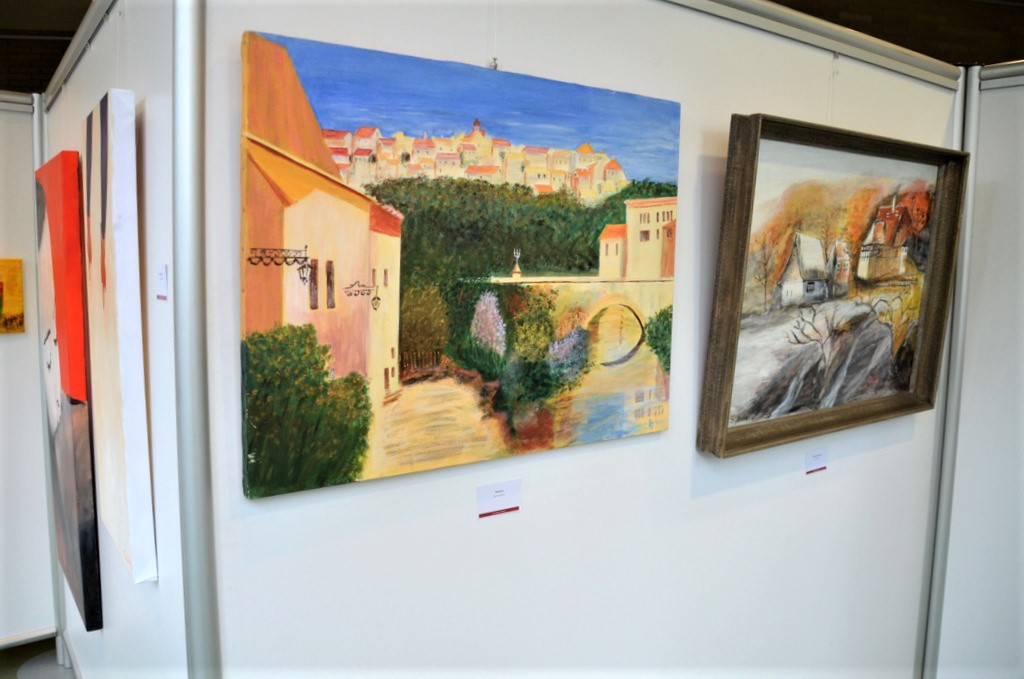 Renate Tombrock liebt Motive, bei denen man durch ein Fenster oder eine Öffnung ins Freie sehen kann. Eines ihrer Ölgemälde zeigt den Blick aus dem Freilichtmuseum Klockenhagen, das andere den Blick von der Wehrmauer Schloss Burg auf die Sankt Martinus-Kirche. Sabine Schulz-Wolff betreut seit vielen Jahren ehrenamtlich die Malgruppe des Gerhard-Berting-Hauses aus Solingen-Wald, die acht Bilder ausgestellt hat. „Unsere Teilnahme hat schon Tradition“, so Andrea Peter, die Leiterin des Sozialen Dienstes.