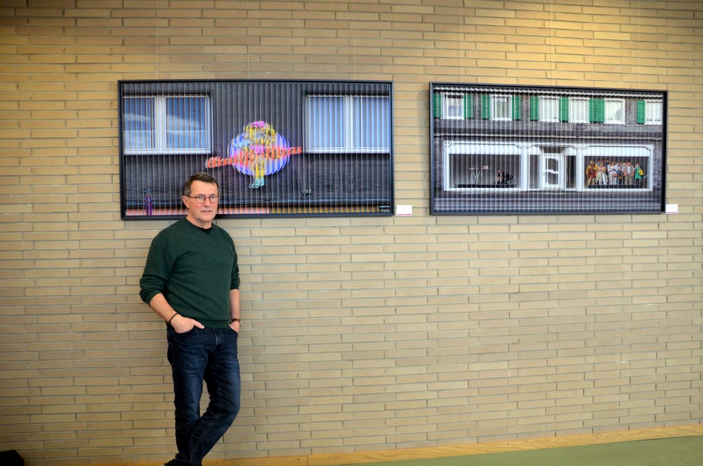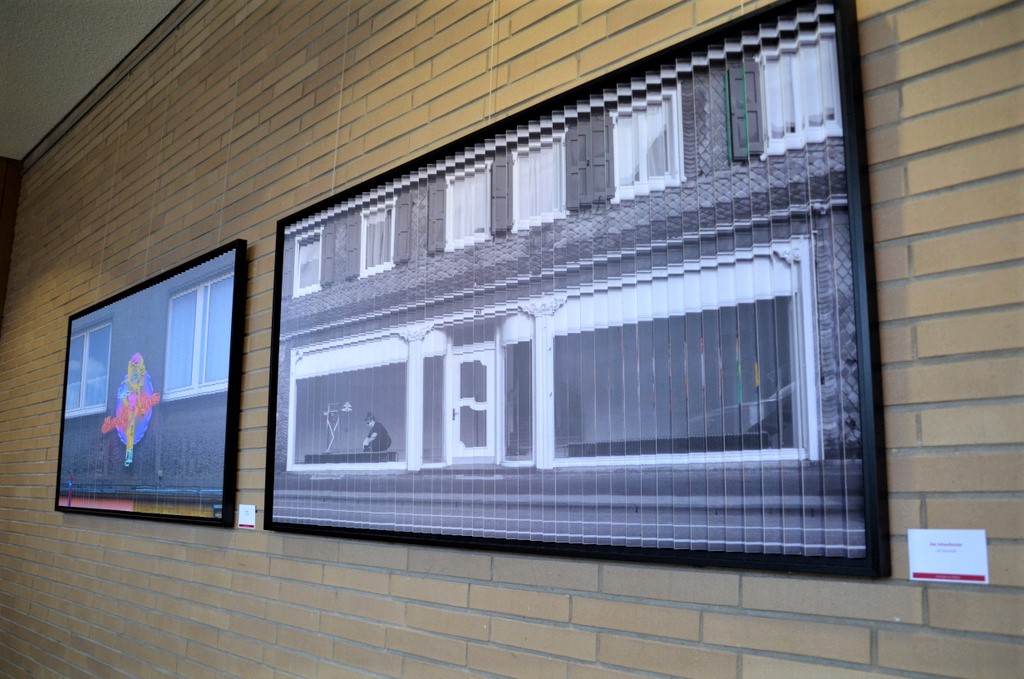 Ulli Steinküllers 2SichtBilder in der eigens von ihm entwickelten Lamellenkonstruktion rufen immer Erstaunen hervor. Abhängig von der Perspektive zeigen sich dem Betrachter zwei völlig unterschiedliche Bilder, die in der Frontalen zu einer abstrakten Collage verschmelzen. In diesem Jahr hat sich der Fotokünstler für zwei Solinger Motive entschieden. Eines stellt ein leeres Schaufenster im Solinger Zentrum dar. Beim Wechsel der Perspektive sieht man Menschen, die im Schaufenster stehen. Anhand des Motivs „Charly’s Diner“ verdeutlicht Steinküller, wie oft man an Dingen vorbeikommt, ohne sie wirklich wahrzunehmen.