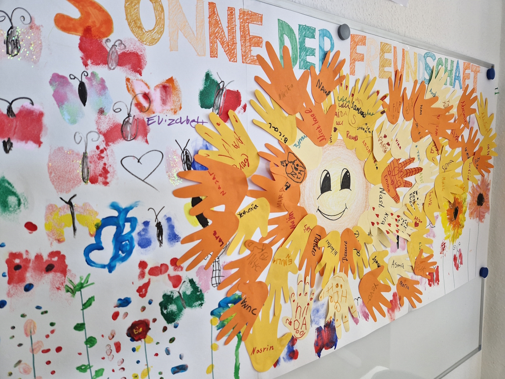 Die ehrenamtlichen Helferinnen hatten ein liebevoll gestaltetes Programm vorbereitet, bei dem für jedes Kind etwas dabei war. An Bastel- und Malstationen konnten kleine Kunstwerke entstehen, an einer Wand wurde sogar eine große „Sonne der Freundschaft“ gebastelt. Zwischendurch stand immer wieder Bewegung auf dem Programm. Bei kleinen Tanzeinlagen konnten sich die Kids zwischendurch immer wieder austoben. Es war laut, bunt, trubelig – genau so, wie ein Kindertag sein soll.